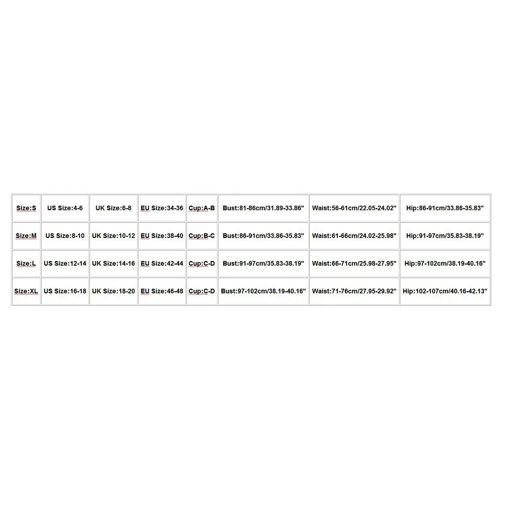 Размер Американский размер Размер Великобритании Европейский размер Чашка Бюст Талия Бедра S 4-6 6-8 34-36 A-B 81-86 см/31,89-33,86'' 56-61 см/22,05-24,02'' 86-91 см/33,86-35,83'' М 8-10 10-12 38-40 B-C 86-91 см/33,86-35,83'' 61-66 см/24,02-25,98'' 91-97 см/35,83-38,19'' L 12-14 14-16 42-44 C-D 91-97 см/35,83-38,19'' 66-71 см/25,98-27,95 дюйма 97-102 см/38,19-40,16'' XL 16-18 18-20 46-48 C-D 97-102 см/38,19-40,16'' 71-76 см/27,95-29,92'' 102-107 см/40,16-42,13''