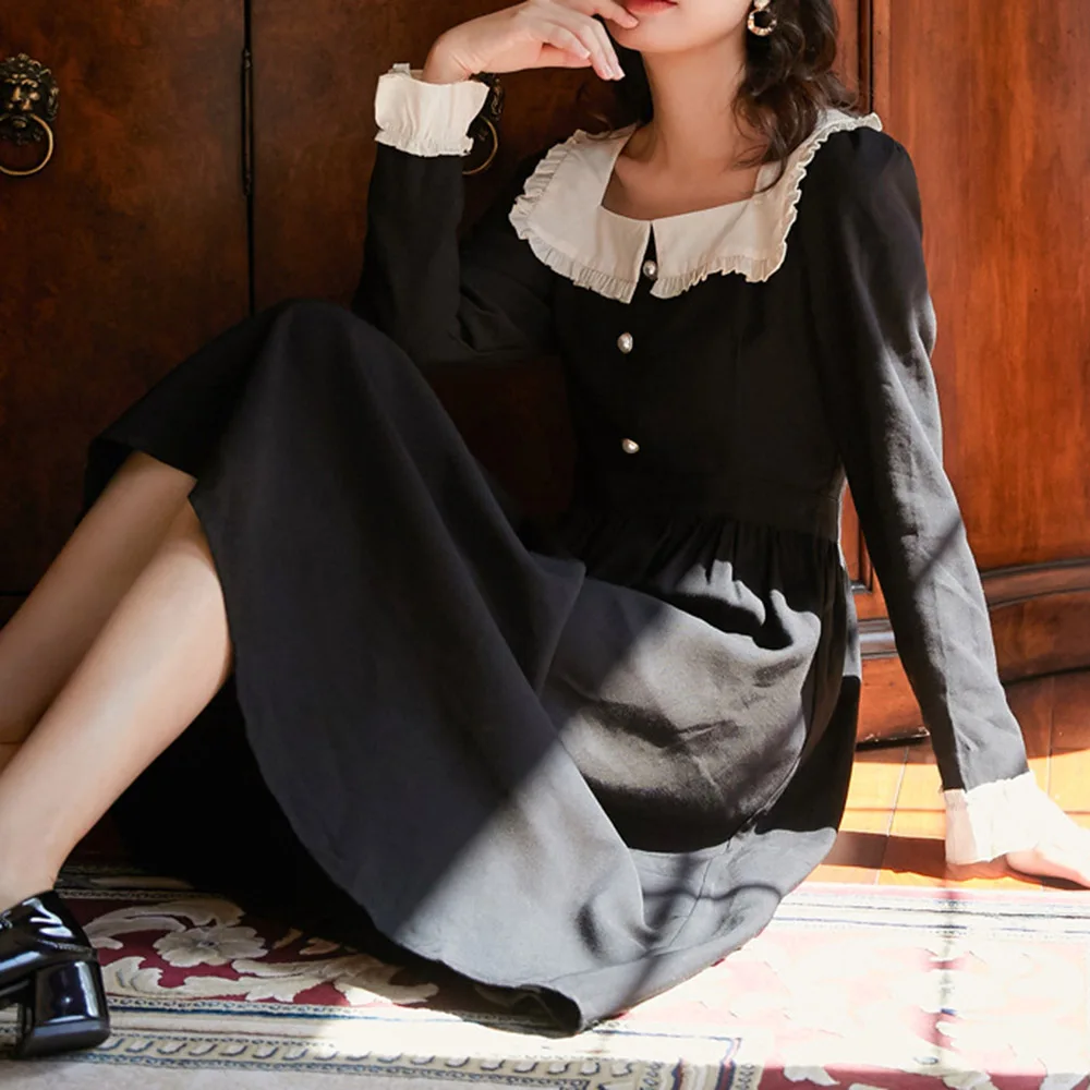Gothic Women Lolita Dresses Summer Elegant Party Black Evening Big Size Bow Collar Pleated Lace Up Goth Vintage White Chic Dress