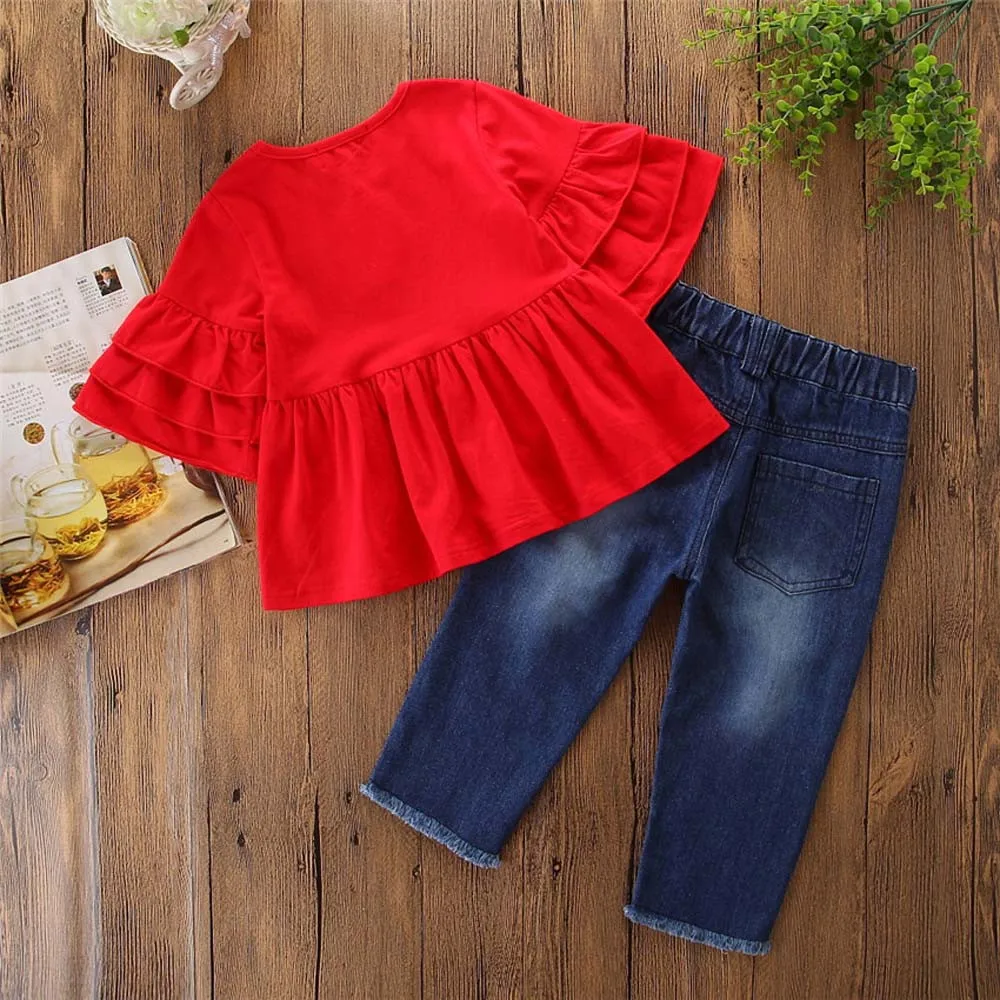 Одежда для маленьких девочек Футболка с оборками Топы + джинсовые штаны с вышивкой