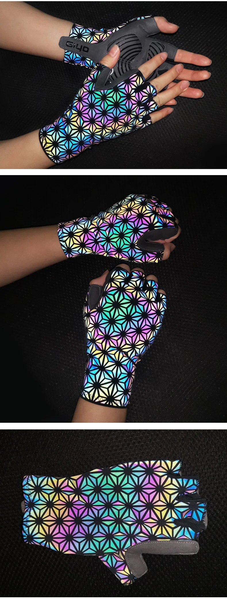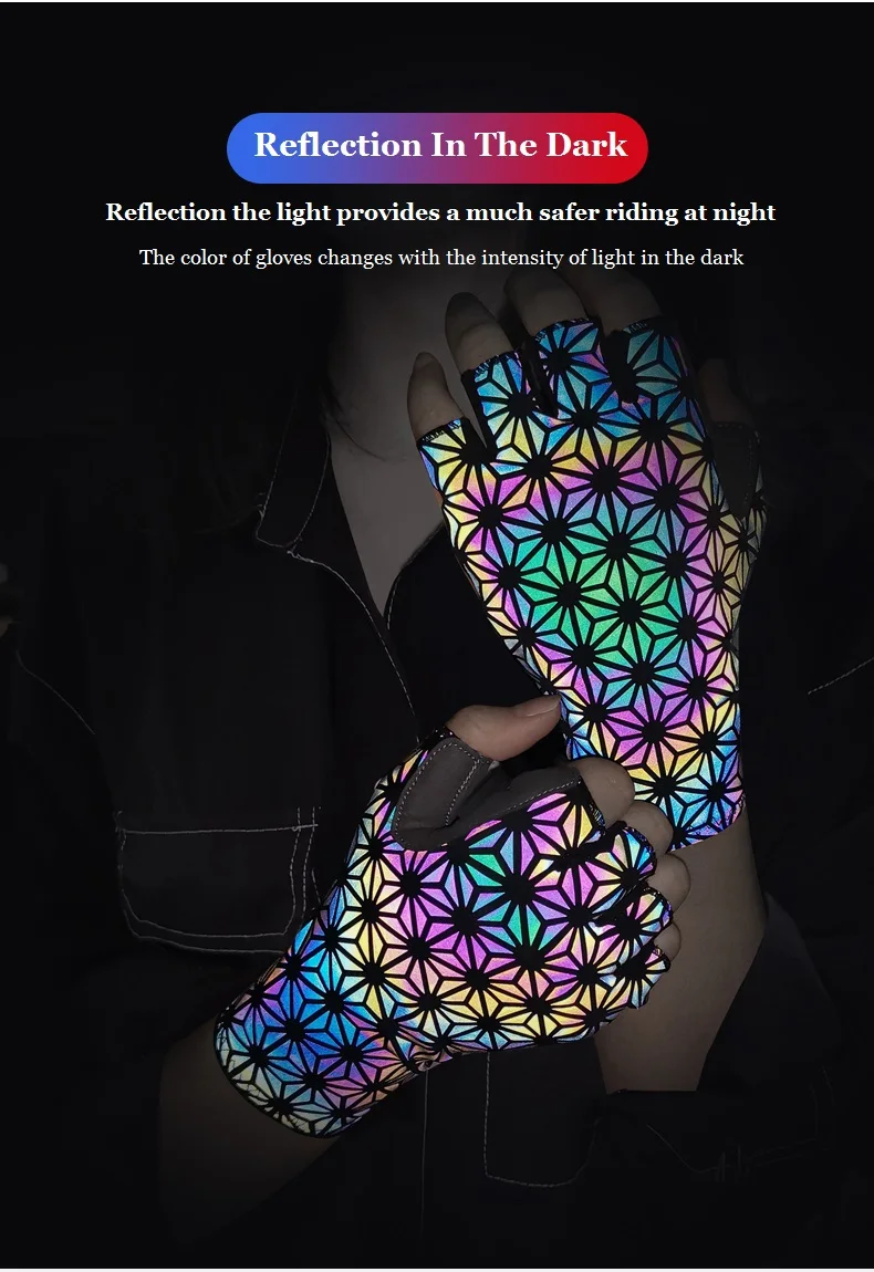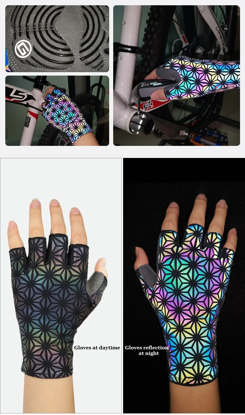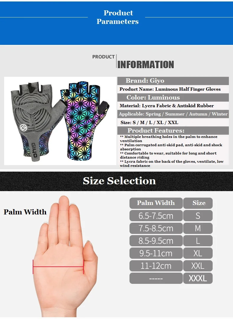 * Размер: XS / S / M / L / XL / XXL* Цвет: синий, черный, красный, белый* Пол: мужской/женский* Применение: тренировки, езда, рыбалка, бег, альпинизм, Спорт на открытом воздухе** Гель и подкладка из ЭВА эффективно поглощают вибрации и уменьшают давление на руки.** Влагоотводящая эластичная лайкра на спине позволит вам чувствовать себя прохладно и комфортно.** Воздушные отверстия на ладонях и пальцах сохраняют ваши руки дышащими.** Большой палец имеет мягкую накладку из микрофибры, чтобы вытереть пот. И регулируемая застежка обеспечивает индивидуальную посадку.Светящиеся перчатки с полупальцами