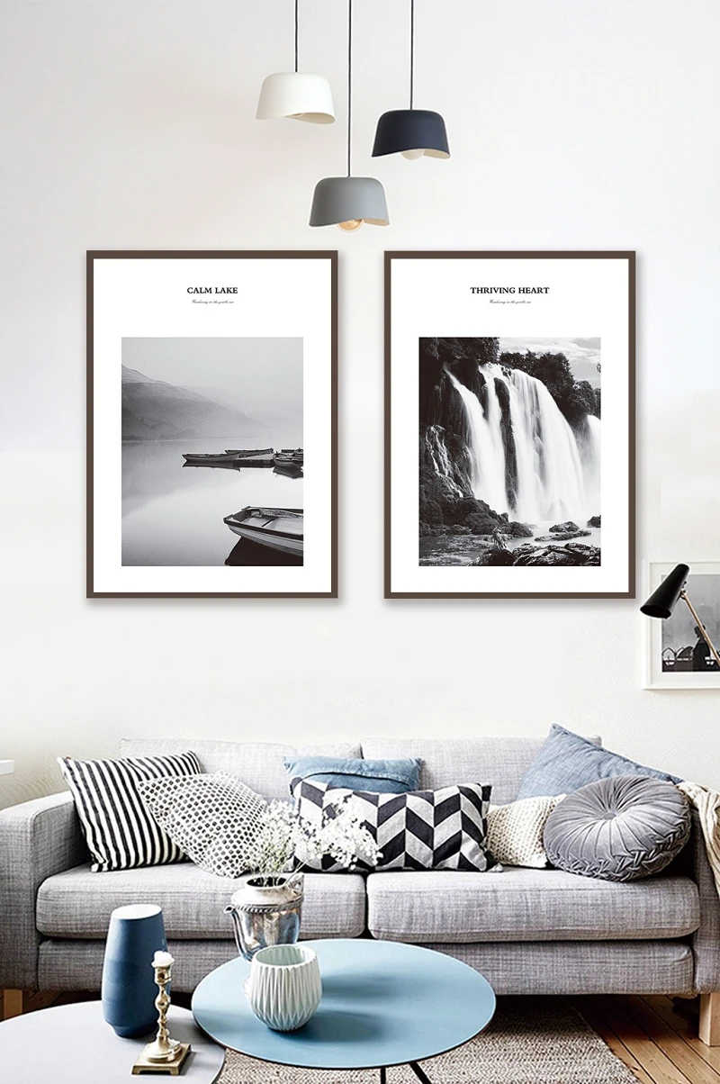 Спокойное озеро и водопад пейзаж черно-белый HD фото холст печать плакат скандинавский стиль для гостиной 3-40