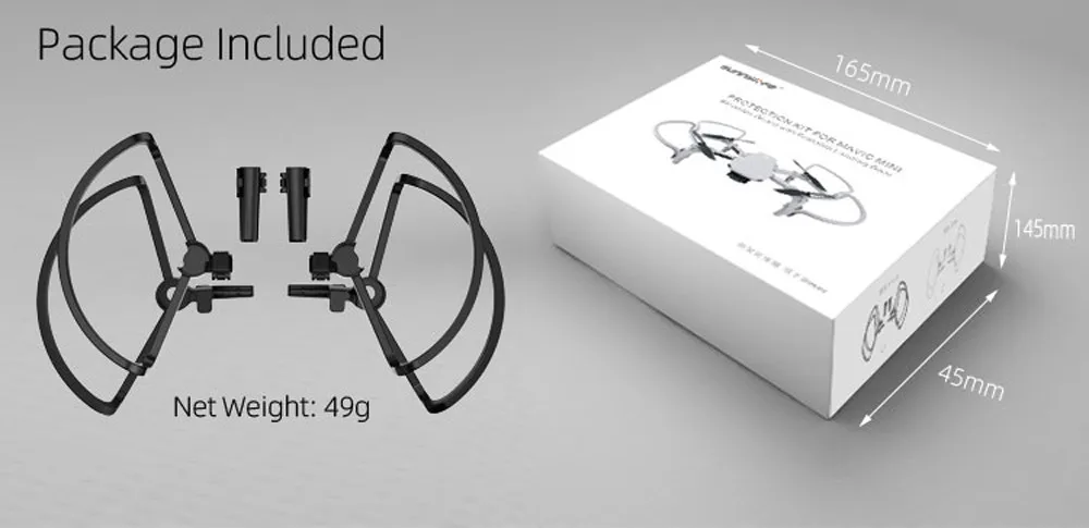 Lightweight and small, easy to carry and storage Quick release design, easy to install and remove Isolated propeller protection propeller Largely prevents the propeller from scratching people or objects Fully protects the propellers and improves flight safety. Foldable tripod for easy use and storage Can be increased by 31mm, effectively protecting the PTZ lens and the bottom of the body It is especially useful for beginners, or when flying indoors or in places with many obstacles Specification: Item: Propeller guard with landing gear Color: Black, Grey Suitable for Mavic Mini DronePackage:
