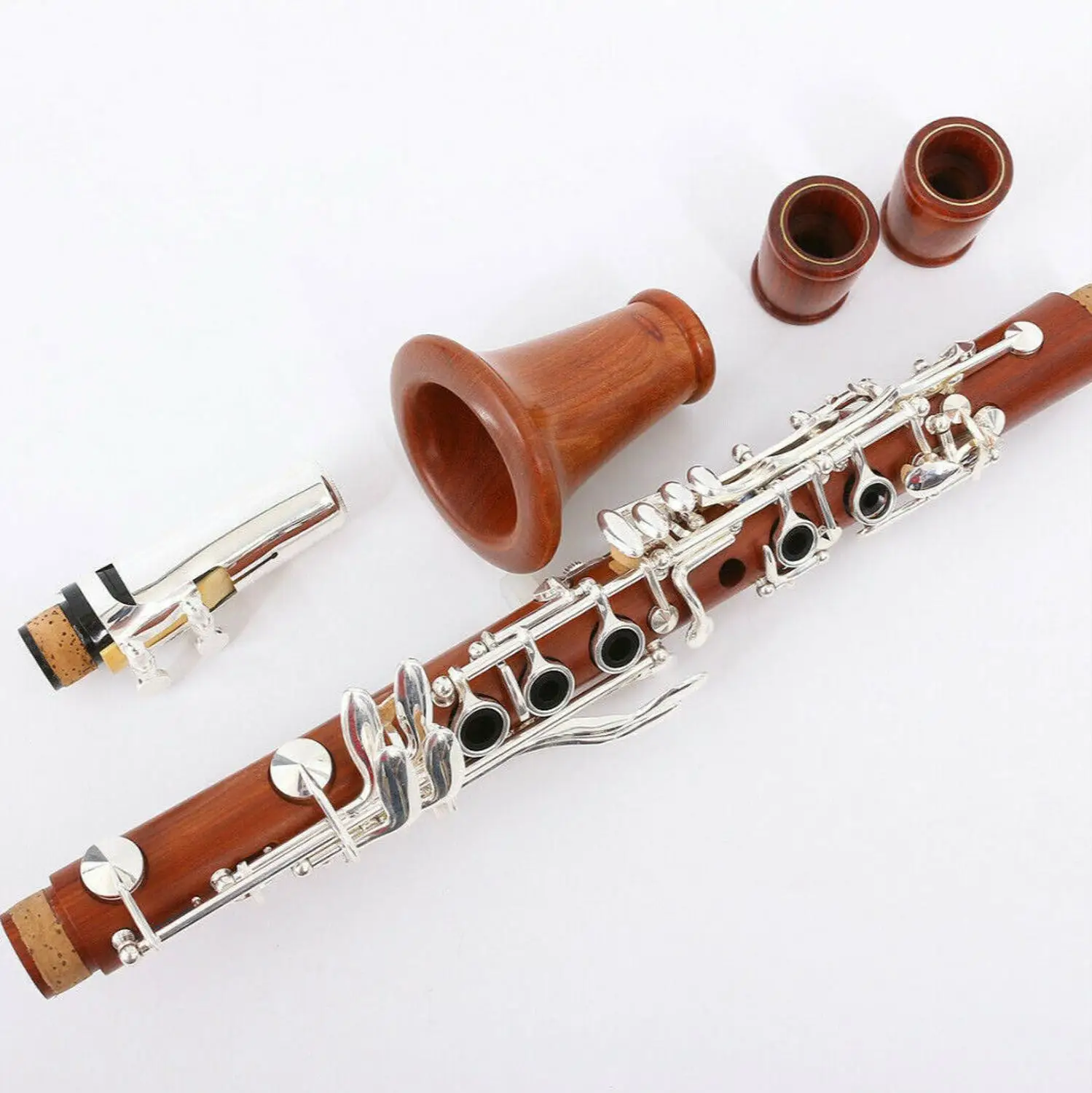 Кларнет Особенности: Красочный и красивый кларнет, Эбонит дерево Прочные никелевые посеребренные ключи, высококачественный материал Большой диаметр шеи и небольшой диаметр шеи Встроенный с вибрацией ключи Регулируемый упор для большого пальца Профессиональный тон, высококачественные подушечки.