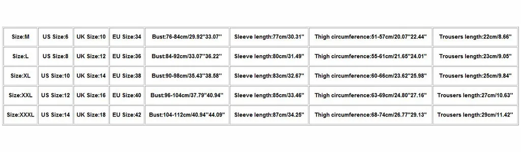 Размеры Нам Размеры UK Размеры ЕС Размеры Обхват груди Длина рукава Обхват бедер Длина брюк М 6 10 34 76-84 см/29,92 "33,07'' 77 см/30,31" 51-57 см/20,07 "22,44" 22 см/8,66" L 8 12 36 84-92 см/33,07 ''36.22'' 80 см/31,49" 55-61 см/21,65 "24,01" 23 см/9,05" XL 10 14 38 90-98 см/35,43 ''38.58'' 83 см/32,67" 60-66 см/23,62 "25,98" 25 см/9,84" XXL 12 16 40 96-104 см/37,79 "40,94'' 85 см/33,46" 63-69 см/24,80 "27,16" 27 см/10,63'' XХХL 14 18 42 104-112 см/40,94 '44-ом. 09" 87 см/34,25" 68-74 см/26,77 "29,13" 29 см/11,42''