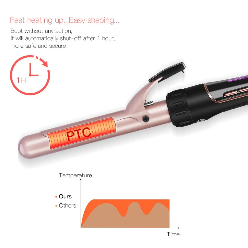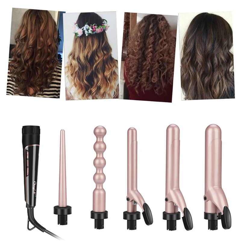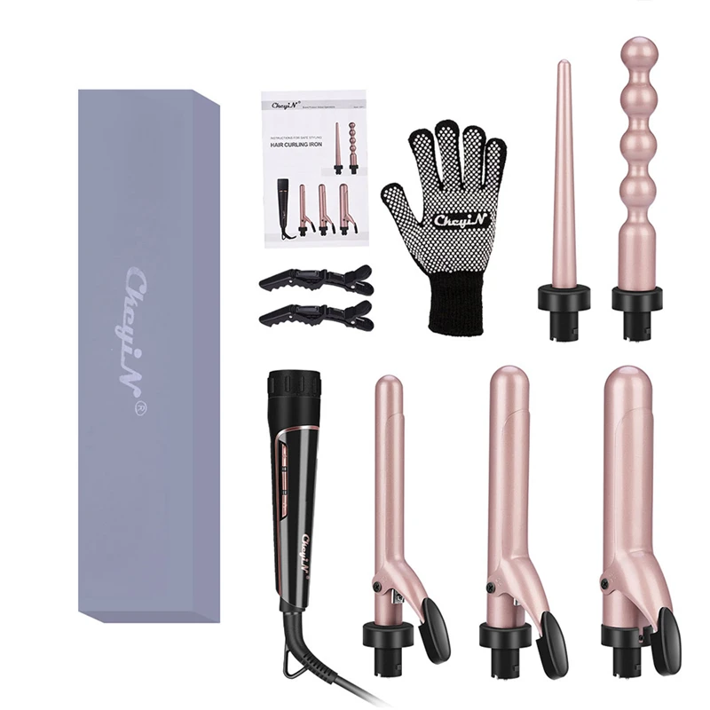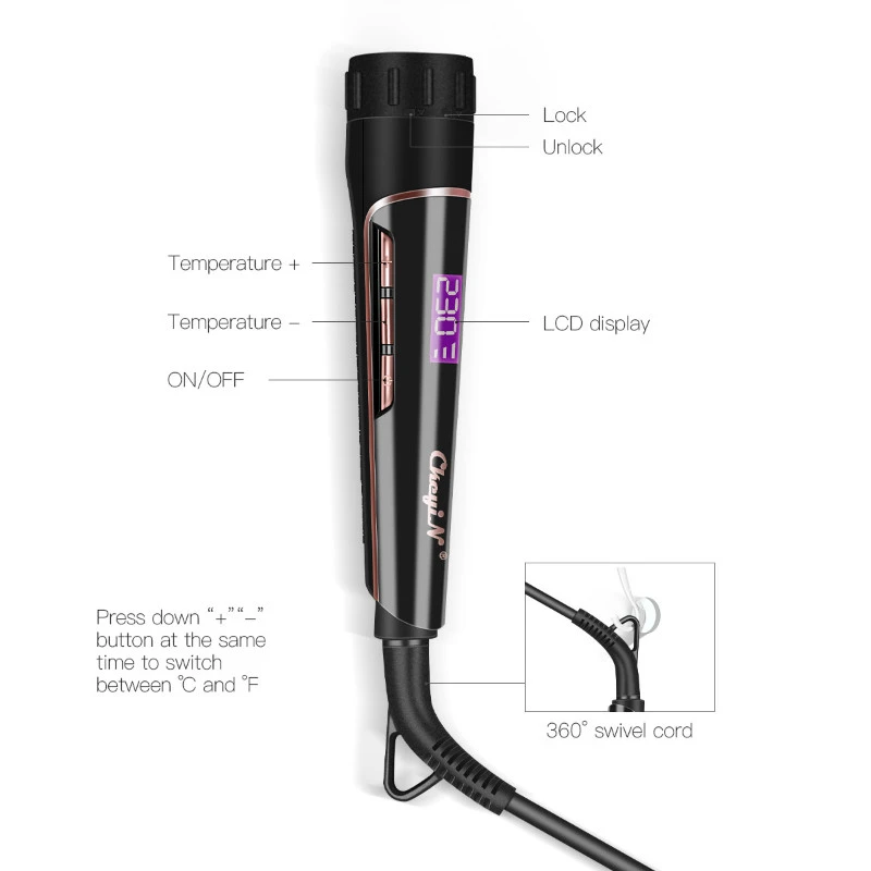 Набор для завивки волос 5 в 1 с различными размерами бочки: 09-18 мм, 19 мм, 25 мм, 32 мм, 25 мм. Бочка с функцией блокировки и разблокировки позволяет легко надевать и вынимать. ЖК-дисплей цифровой температуры, легко проверить температуру тока. Регулируемая температура от 80 ℃ до 230 ℃(180 °F до 450 °F), вы можете отрегулировать соответствующую температуру в соответствии с текстурой волос. Нажмите и удерживайте кнопку «+» и «температура»-» одновременно, вы можете переключаться между градусами Цельсия (℃) и фаренгейтом (℉). Нагревательные элементы PTC, Быстрое нагревание. Турмалиновые керамические нагревательные бочки обеспечивают равномерный нагрев, который может уменьшить повреждение волос, сделать ваши волосы здоровыми, естественными и блестящими. Он автоматически отключится через один час, более безопасный и безопасный. 2,5 м 360 градусов поворотный шнур питания, вы можете вращать его под любым углом, не беспокоясь о обмотка.