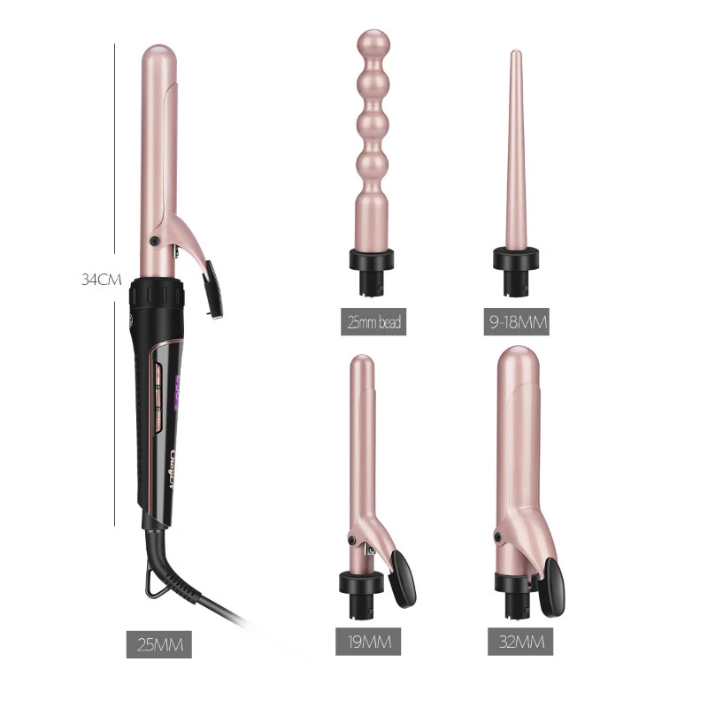 Материал теплопроводности: турмалиновая керамика Нагревательные элементы: PTC Диаметр ствола: 09-18 мм/19 мм/25 мм/32 мм/25 мм Напряжение: 100-240 В Частота: 50/60 Гц Мощность: 85 Вт Применимые волосы: сухие и влажные Рабочая температура: 80 ℃ ~ 230 ℃(180 °F ~ 450 °F) Регулируемая Режим сборки шнура питания: Поворот на 360 ° Длина шнура: 2,5 м Общая длина: 34 см Цвет: золотистый Вес: 860 г
