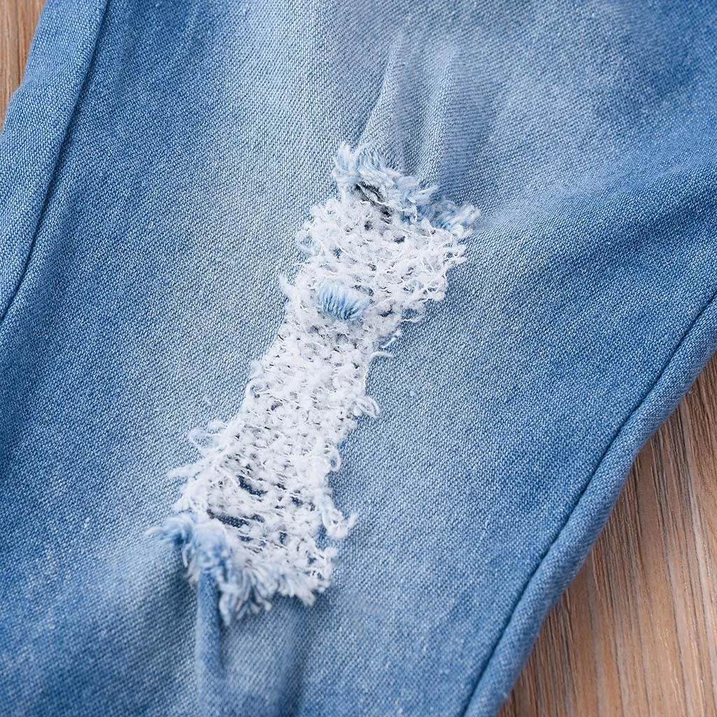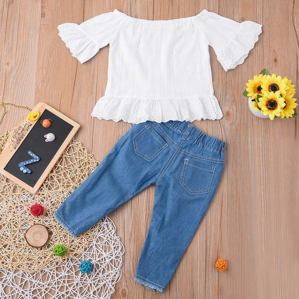 Однотонные кружевные топы с короткими рукавами и джинсовые штаны для новорожденных девочек, комплект из 2 предметов