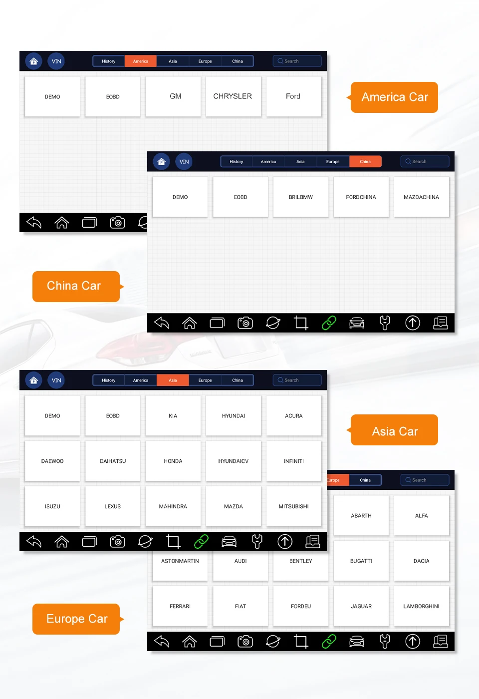 Американское покрытие Для Chrysler, для Ford, для GM, для GMBRAZIL (только для бразильского рынка) Азиатское покрытие Для Acura, для Daewoo, для Daihatsu, для Honda, для Hyundai, для Hyundai CV, для Infiniti, для Isuzu, для Kia, для Lexus, для Mazda, для Mitsubishi, для Nissan, для Scion, для Ssang Yong, для Subaru, Для Suzuki, для Toyota, для Mahindra, для Tata (только для рынка Индии) Европейское покрытие Для Abarth, для Alfa-Romeo, для Audi, для Aston Martin, для Bentley, для BMW, для Bugatti, для Citroen, для Dacia, для Ford в ЕС, для Fiat, для Ferrari, для Jaguar, для Lancia, для Land Rover, Для Lamborghini, для Maserati, для Maybach, для Mercedes Benz, для Mini, для Opel, для Peugeot, для Renault, для Rolls-royce, для Porsche, для Saab, для сиденья, для Skoda, для Smart, для Sprinter, для Vauxhall , Для Volvo, для VW, для VW_CV. Китайское покрытие Для BJ HYUNDAI, для BRILBMW, для DF HONDA, для DYK, для FORD CHINA, для GQ FIAT, для GZ HONDA, для MAZDA CHINA, для SAIC SKODA, для SACI VW, для TOYOTA CHINA, для FAW AUDI, для FAW VW, Для DFXK / DFFG, для FOTON Не поддерживает Жигули, УАЗ, ВАЗ.