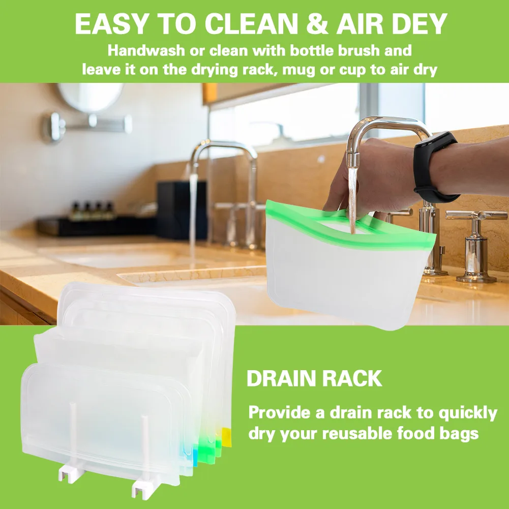 Очень удобно в использовании. Просто ручная Стирка в этих пакетах с комнатной температурой воды, и каждый набор многоразовых пакетов вместе с специальной сушильной стойкой. Пожалуйста, не используйте в посудомоечной машине. Рекомендуется ручная стирка, так как посудомоечная машина повредит застежку-молнию в пакетах для хранения продуктов.