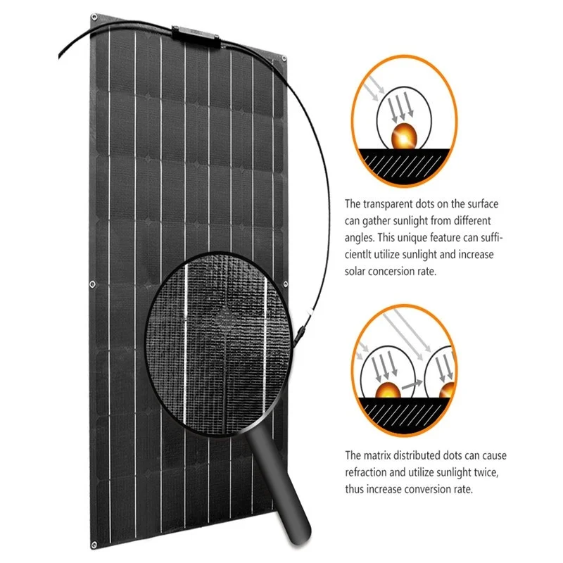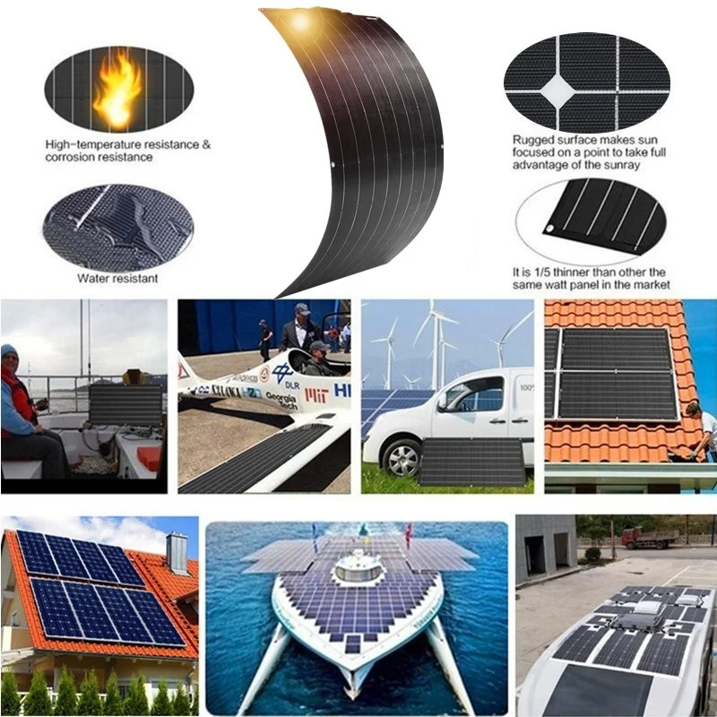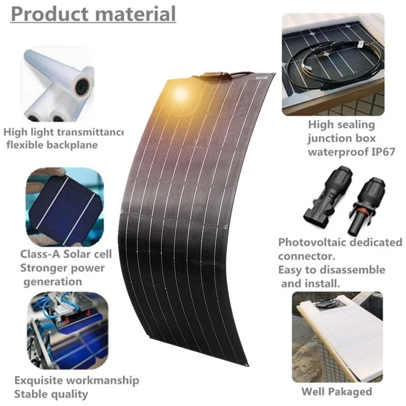 Простота в использовании: Этот продукт представляет собой полу-гибкую доску, которая может быть согнута до 30 градусов. Он подходит для установки на неровных гладких поверхностях, таких как крыши RV, лодки, палатки, яхты, сводчатые крыши и т. д. Высокая эффективность, легкий вес: толщина всего 2,5 мм, Вес 1,7 кг, Легко повесить, разобрать и носить с собой. Простота установки: металлические отверстия в четырех углах изделия для фиксации винтов и крепления. Каждая солнечная панель была протестирована несколько раз. Распределительная коробка на задней панели солнечной панели имеет диод Шоттки, встроенный для предотвращения обратного тока. Солнечная панель работает при напряжении 16 В. Пожалуйста, приобретите Солнечный контроллер для зарядки аккумулятора.