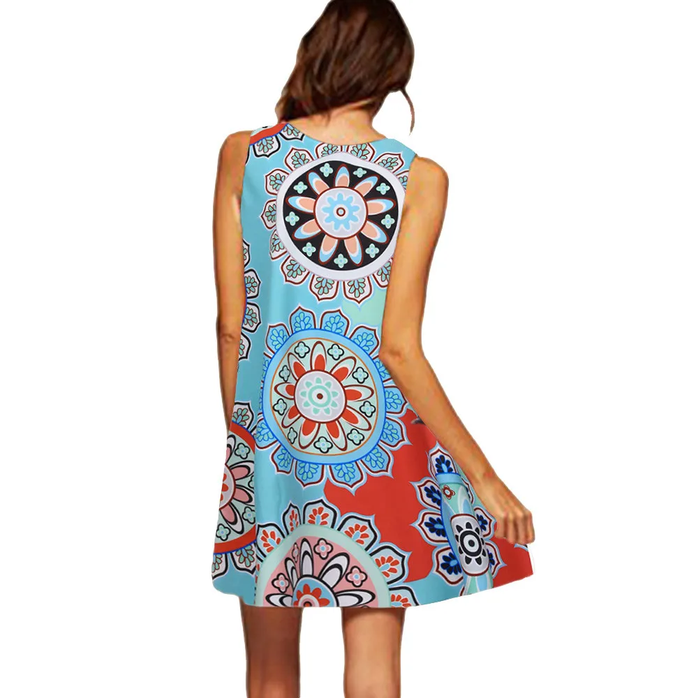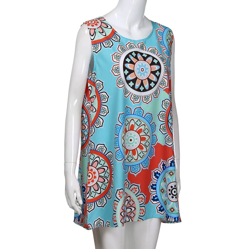 Винтажный бохо Женское летнее пляжное Короткое мини-платье без рукавов с принтом