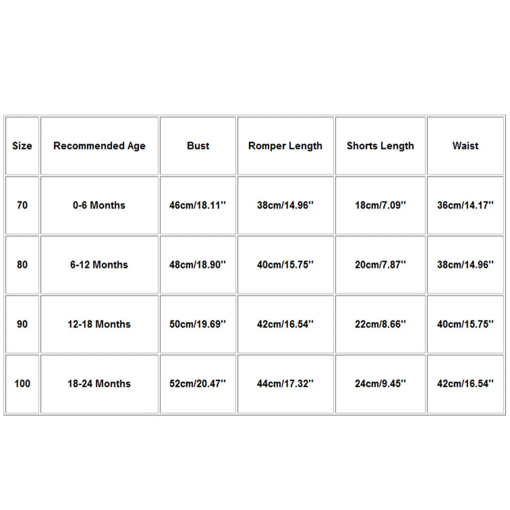 Размер Рекомендуемый возраст Бюст Длина комбинезона Длина шорт Талия 70 0-6 месяцев 46 см/18,11'' 38 см/14,96'' 18 см/7,09'' 36 см/14,17'' 80 6-12 месяцев 48 см/18,90'' 40 см/15,75'' 20 см/7,87'' 38 см/14,96'' 90 12-18 месяцев 50 см/19,69'' 42 см/16,54'' 22 см/8,66'' 40 см/15,75'' 100 18-24 месяцев 52 см/20,47'' 44 см/17,32'' 24 см/9,45'' 42 см/16,54''