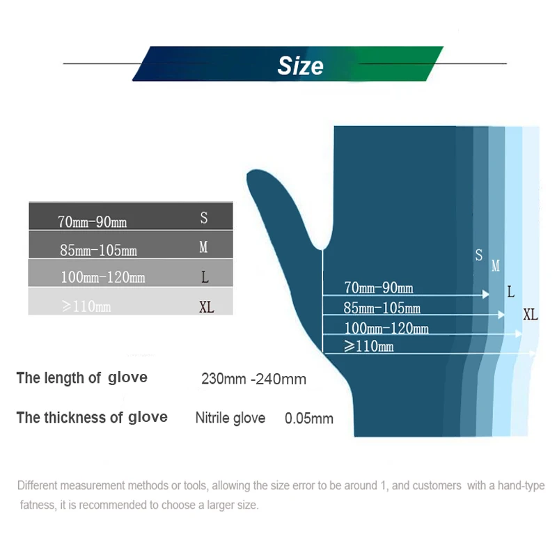 1. Сколько pacs в одной коробке? 100 шт./кор. = 50 пар. 2. Для чего используется? Идеально подходит для механических техников, татуировщиков, правоохранительных и лабораторных установок или в любом месте требуется прочная нитриловая перчатка с профессиональным нитриловым внешним видом.