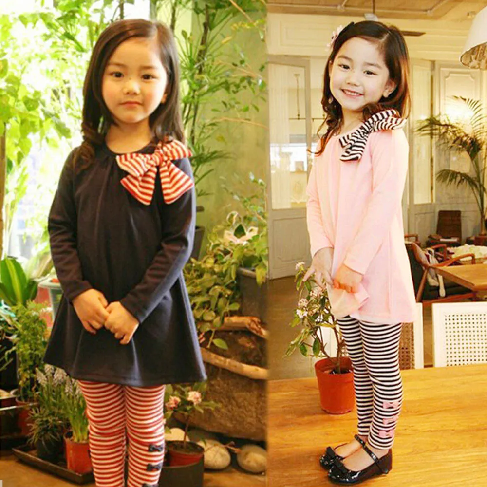 Детская одежда из 2 предметов для маленьких девочек, платье с длинными рукавами и бантом, футболка + футболка в полоску Комплект со штанами