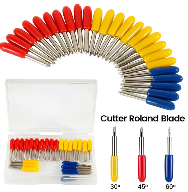 Технические характеристики: Название: резец с надписями Roland Материал: Вольфрамовая сталь Характеристики: 30 градусов, 45 градусов, 60 градусов Функция: самоклеящаяся бумага, переводная бумага, рекламный высококачественный светоотражающий материал, тонкий картон, полиэтилен и т. Д. Цвет: желтый, красный, синий