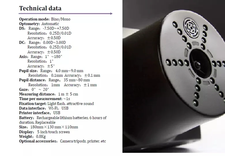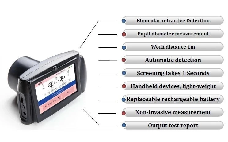 Широко используется в общественных больницах, детских садах, начальной школе .... Бинокулярное обнаружение, может тестировать глаза boths одновременно Фокус-измерение-расчет-результат, менее 3 секунд! Ультразвуковая Сортировка и автофокусировка выполняется от 1 м. Wi-Fi передачи печати че