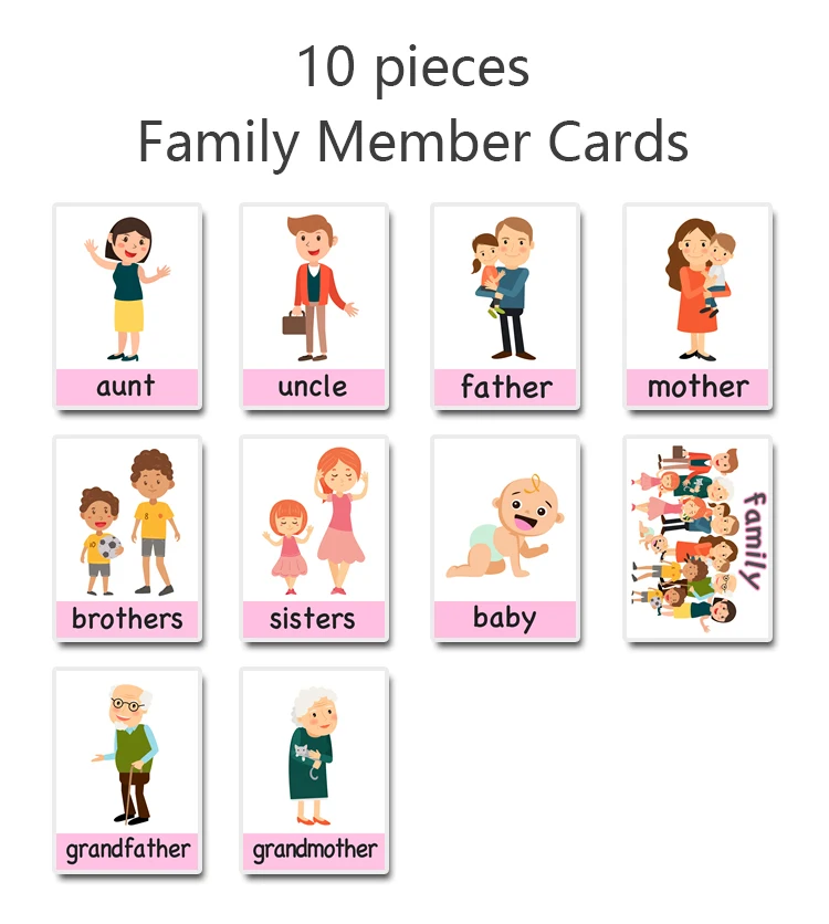 10 шт., материалы Монтессори, Детские Обучающие карты на английском языке для детей, имя члена семьи, флеш-карты, Ранние развивающие игрушки