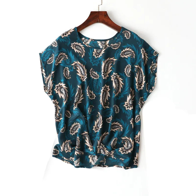 Женская Летняя шелковая блузка с круглым вырезом и коротким рукавом, Офисная Повседневная блузка из натурального шелка, полосатая Базовая летняя рубашка из натурального шелка