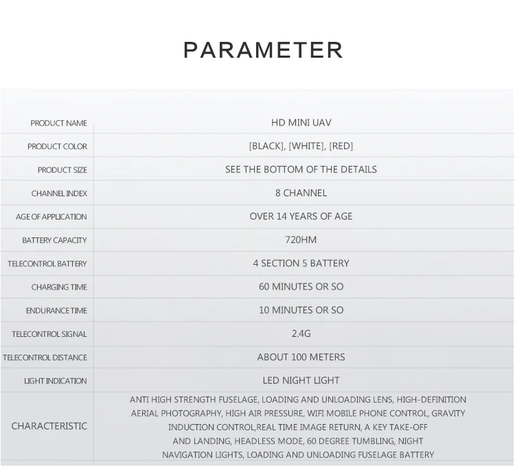 Название продукта: D2 Цвет изделия: черный, белый, красный Продукт Размеры: 20*16*7 см (посылка Размеры),13*13*3,5 см (беспилотный летательный аппарат Размеры) Индекс канала: 6 каналов Возраст aoolication: старше 14 лет Батарея Ёмкость: 720HM Батарея телеуправления: 3 * AAA батареи Время зарядки: 60 минут или около того Время выдержки: 10 минут или около того Телекоммуникационный сигнал: 2,4G Телеуправление расстояние: около 100 метров Светильник индикация: светодиодный ночной Светильник Характеристика: анти-higt прочность фюзеляжа, погрузка и разгрузка объектива, высокой четкости аэрофотосъемки, высокое давление воздуха, Wifi мобильный телефон управления, Гравитационный индукционный контроль, в режиме реального времени возврат изображения, кнопка взлета и посадки, Безголовый режим, 60 градусов падения, ночные навигационные огни, загрузка и разгрузка батареи фюзеляжа