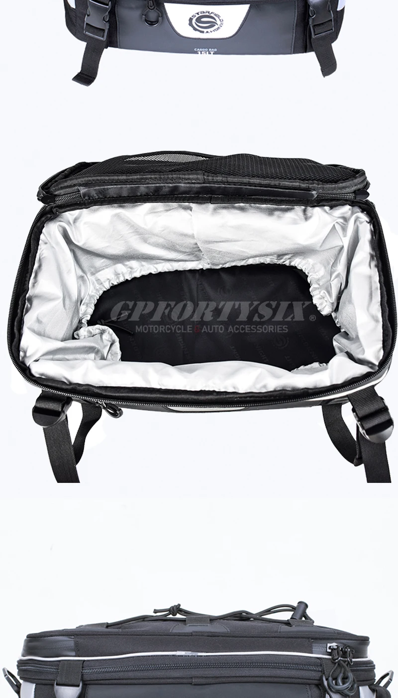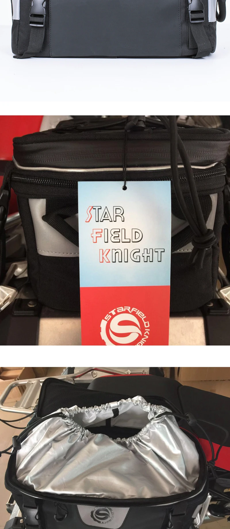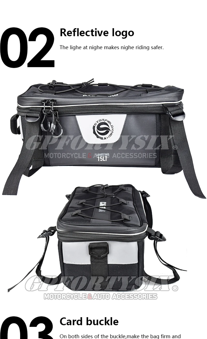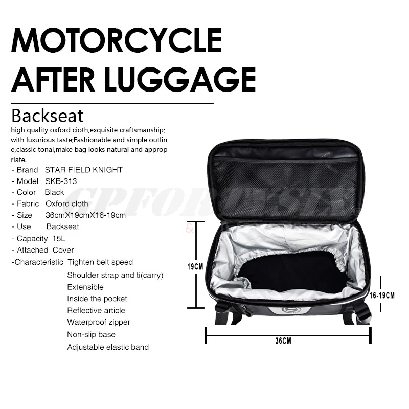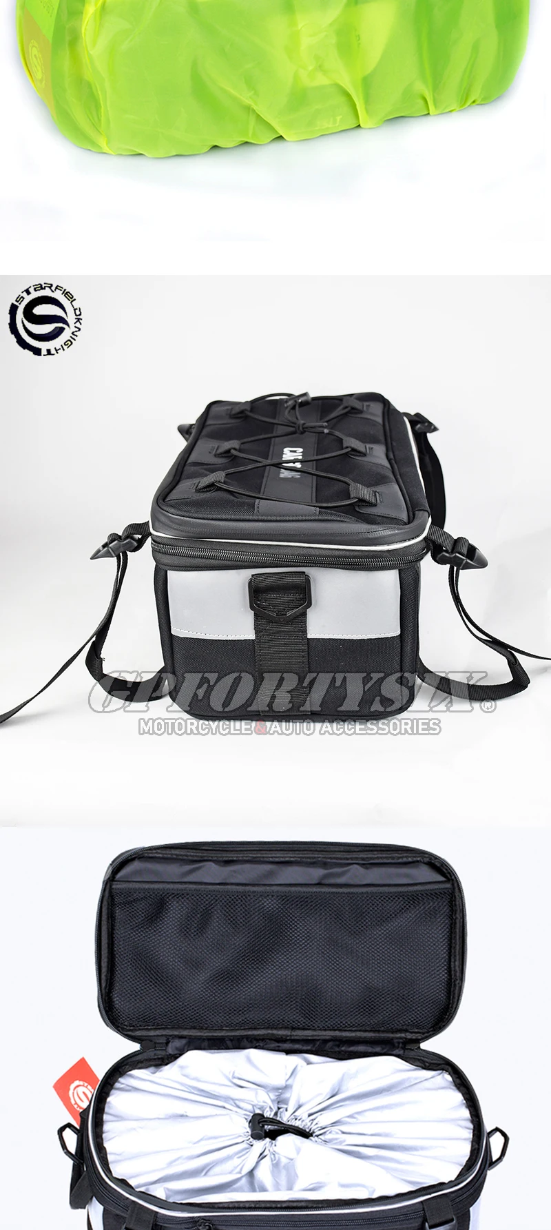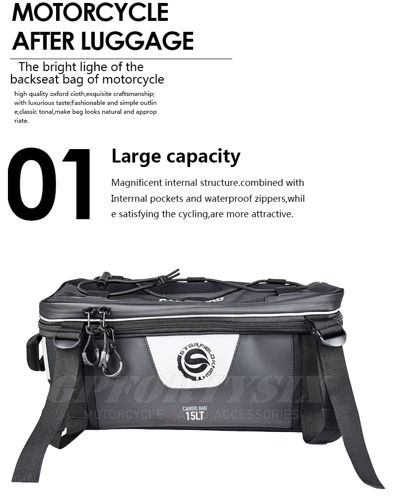 Информация о продукте Бренд: STAR FIELD KNIGHT Модель: SKB-313 Цвет: черный Название: мотоцикл после багажа Ткань: ткань Оксфорд Размер: 36*19*16-19 см Использование: заднее сиденье Прилагается: дождевик Емкость: 15 л Характеристика: 1. Быстро затяните ремень 2. Плечевой ремень и ti (переноска) 3. Расширяемый 4. Светоотражающие изделия 5. Водонепроницаемая молния 6. Нескользящая основа 7. Регулируемый эластичный ремешок