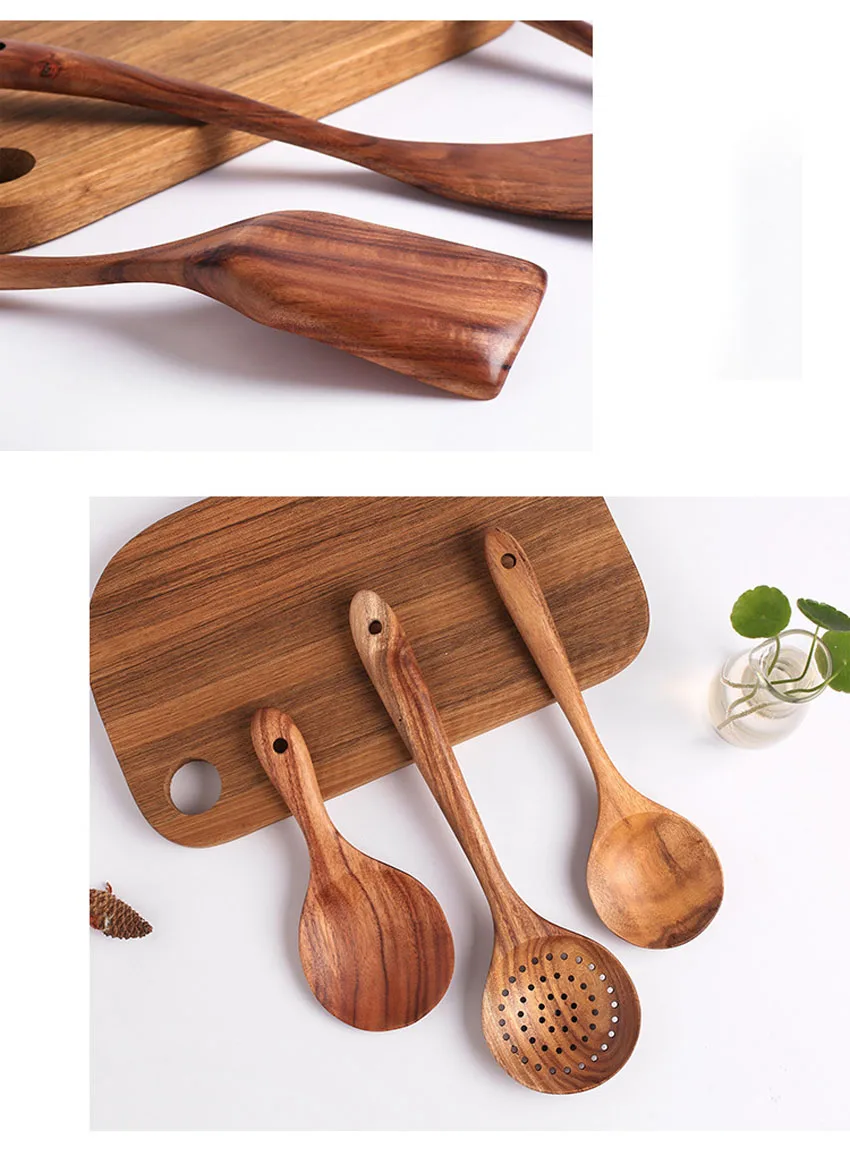 1. Использование чистых натуральных материалов, использование тика в качестве сырья, без краски или воска, четкая видимая текстура, для дома, древесные лопаты, антипригарная сковорода, специальная посуда с длинной ручкой, высокая температура