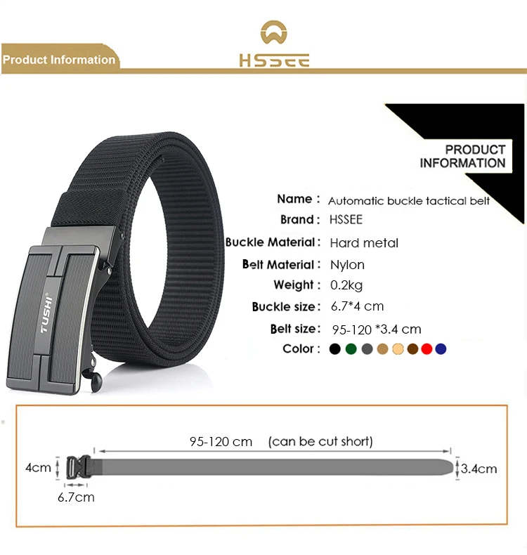 Feature - Hard metal automatic buckle, soft real nylon - 3mm thick, not easy to deform, anti-oxidation, wear-resistant and durable - Length 95-120cm (can be cut short) - The object is more beautiful than the picture - Stylish automatic buckle, perfect for men - Suitable for a variety of outdoor sports Product information Name: Tactical Belt Brand: HSSEE Number: TS4017 Material: Nylon + Metal Color: black, blue, green, red, brown, khaki, wolf brown, gray Buckle size: 6.7*4 cm belt size: 95-120cm Thickness: 3mm 95cm fits 70cm (28") waist 100cm fits 73-77cm (29 "-30") waist 105cm fits 80-83.3.cm (31"-32") waist 110cm fits 87cm (33") waist 115cm fits 90-93.3cm (34 "-35") waist 120cm fits 96-100cm (36 "-37") waist Parcel list 1 * tactical belt 1 * nylon buckle Tips: Please contact me with any questions about the belt, I will reply you within 12 hours (or faster)