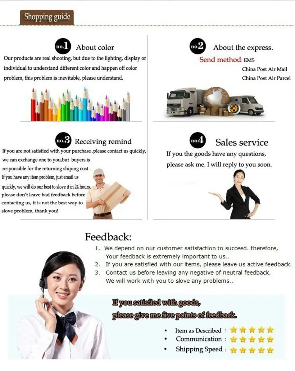 3. Примечание: Время доставки зависит от пункта назначения и других факторов, если вы не получили товар через 40 дней, пожалуйста, свяжитесь с нами, мы будем исследовать и решить проблему доставки.