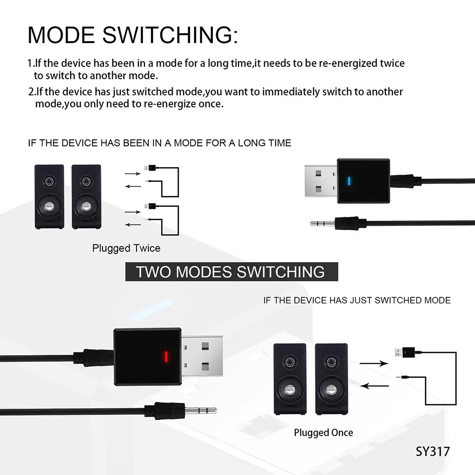Режим RX: имя сопряжения: SY317, найдите SY317 в настройках Bluetooth телефона для сопряжения. Синий светильник мигает во время процесса сопряжения, и синий светильник перестает мигать после успешного сопряжения. Подключите устройство к аудиоустройству с 3,5 аудио кабель.