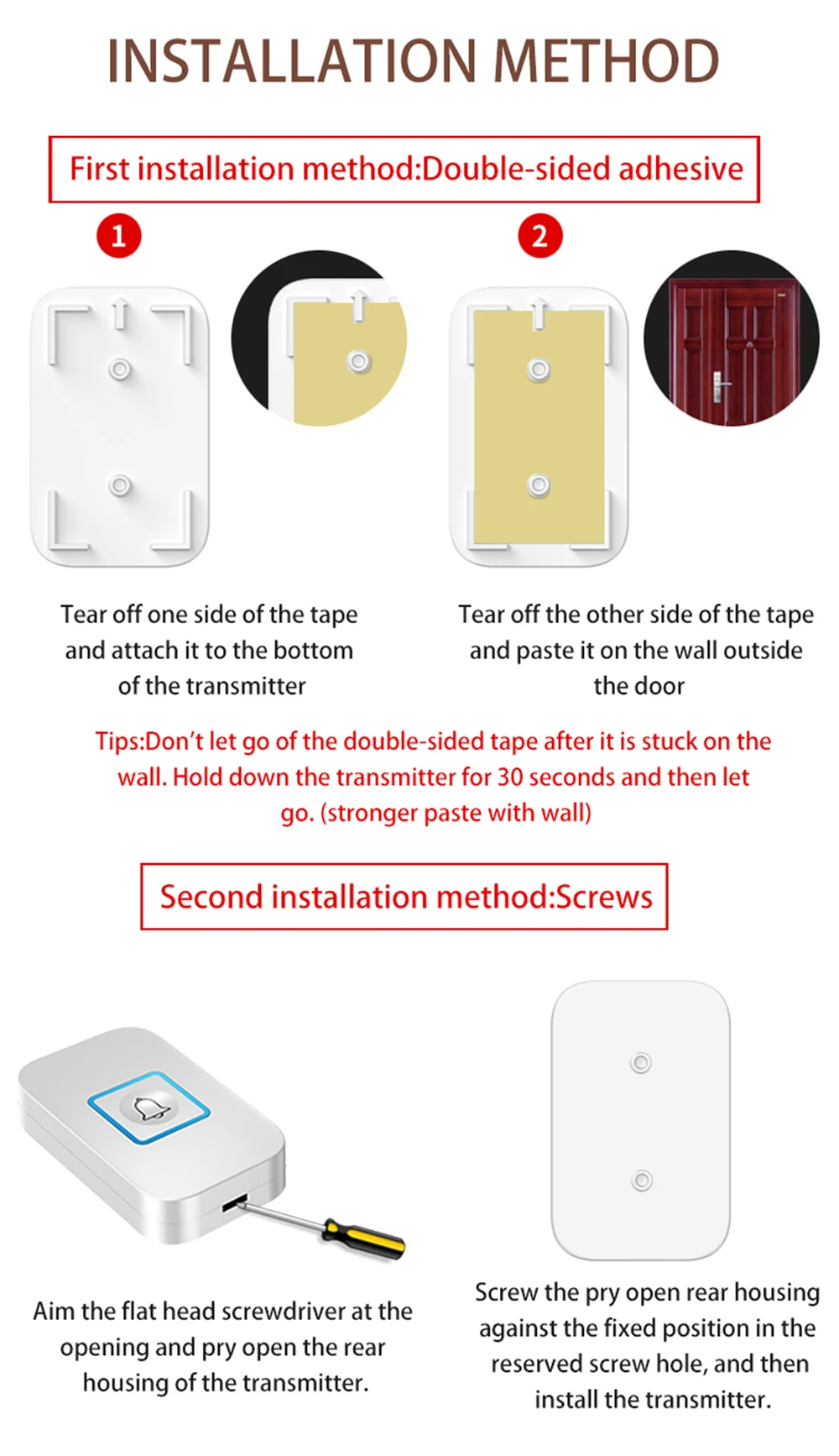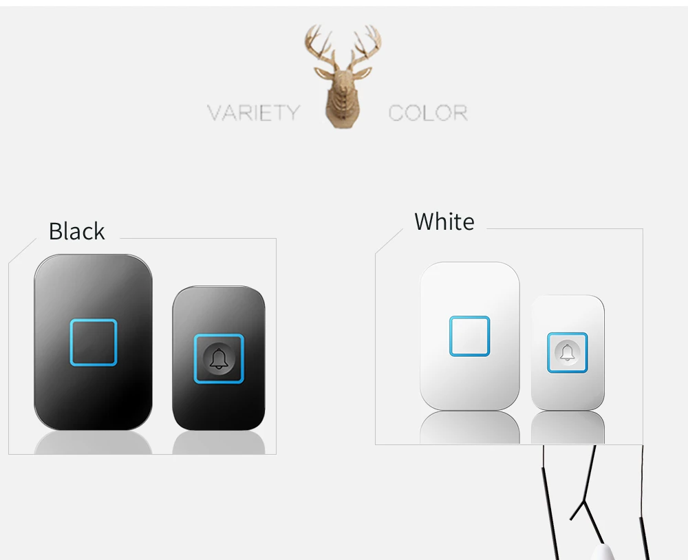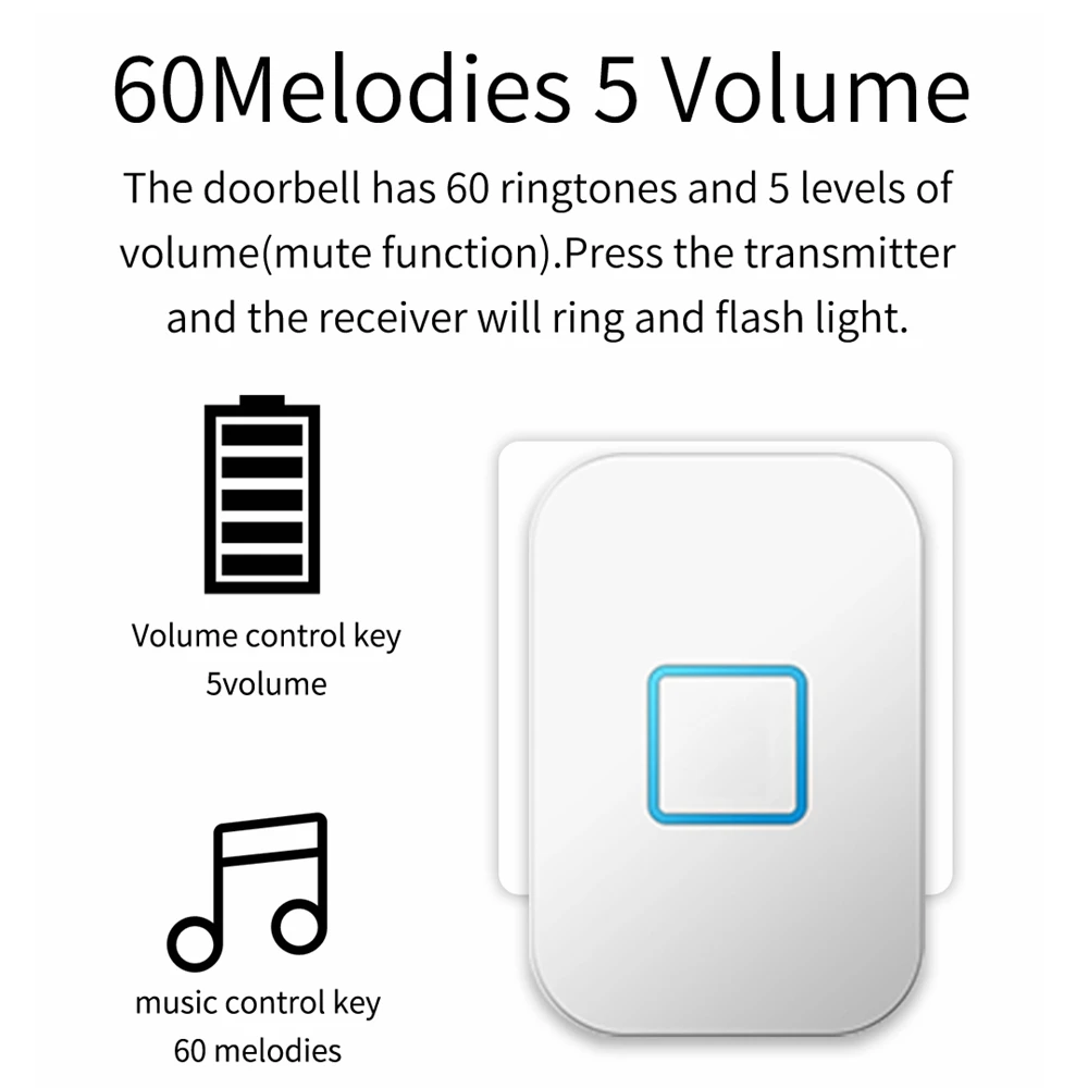 1. Нажмите кнопку, супер обучающий код может свободно научиться сочетать, может быть неограниченным подходящим приемником. 2. Передатчик не имеет винтового патрона, он может быть водонепроницаемым и пыленепроницаемым без резинового кольца. 3. Если несколько кнопок соединены с одним или несколькими приемниками в одной системе, каждая кнопка может быть установлена на другой мелодии звонка. 4. Функция отключения памяти: Включите питание снова после выключения питания, не нужно повторно регулировать и блокировать мелодию звонка. 5. Кнопка дверного звонка использует батарею 23A12V (не входит в комплект), а напряжение приемника составляет 220 В. 6. Приемник доступен в различных вилках, штепсельных вилках США/ЕС/Великобритании и адаптерах Австралии, подходит для большинства стран. 7. Привлекательная подсветка мигает, когда кто-то толкает дверной звонок. Особенно подходит для пожилых, глухих и беременных женщин. 8. Расстояние приема: 300 метров на открытой местности. 9. На беспроводной сигнал будут влиять препятствия. Чем больше препятствий, тем серьезнее потеря сигнала. 10. Приемник имеет 5 уровней (можно отключить звук) 0-110 дБ, 60 музыки на выбор. 11. Размер передатчика: 76*43*22 мм 12. Размер приемника: 90*55*25 мм 14. Просто подключите приемник к электрической розетке, передатчик кнопки может быть приклеен к двери с помощью клейких лент. Примечание: Кнопка не может быть размещена на железной двери, потому что это будет мешать сигналу. Если приемник не звонит при нажатии кнопки после получения дверного звонка, проверьте следующие действия: 1. Если на кнопке установлен аккумулятор, требуется щелочная батарея 23A12V. 2. Вы можете соединить кнопку с приемником.