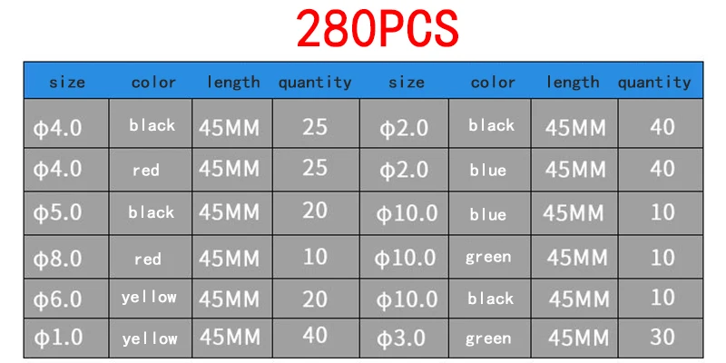 (Количество, диаметр, длина, цвет) 80pcsx1.5x45mm «подсолнухи» 80 шт. x 2,0x45 мм синий 80 шт. x 2,0x45 мм черный 60 шт. x 3,0x45 мм зеленый 50 шт. x 4,0x45 мм красный 50 шт. x 4,0x45 мм черный 30 шт. x 5,0x45 мм черный 20 штук x 6,0x45 мм Цвет: желтый 20 штук x 8,0x45 мм красный 20 штук x 10,0x45 мм зеленый 20 штук x 10,0x45 мм синий 20 штук x 10,0x45 мм черный