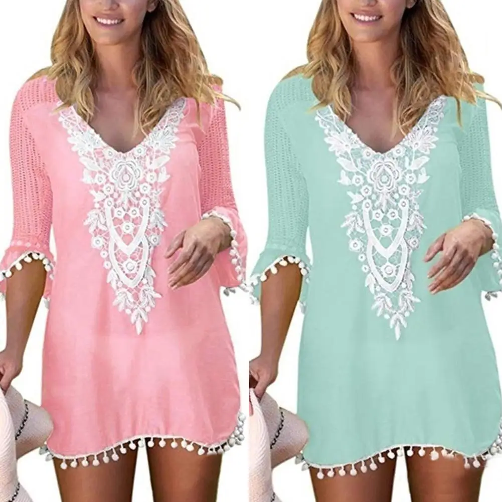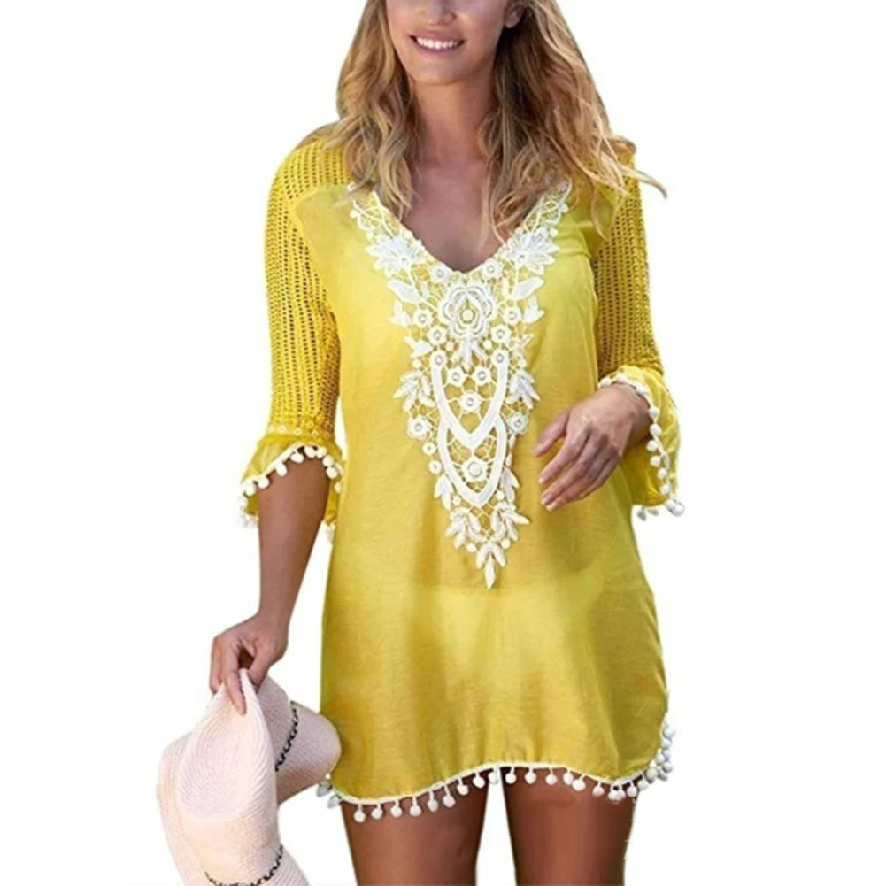 Летняя женская пляжная одежда в богемном стиле, повседневное свободное кружевное платье-бикини с помпоном, платье-накидка, Дамский сарафан, Vestidos