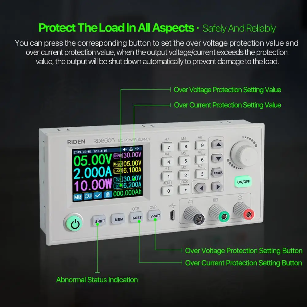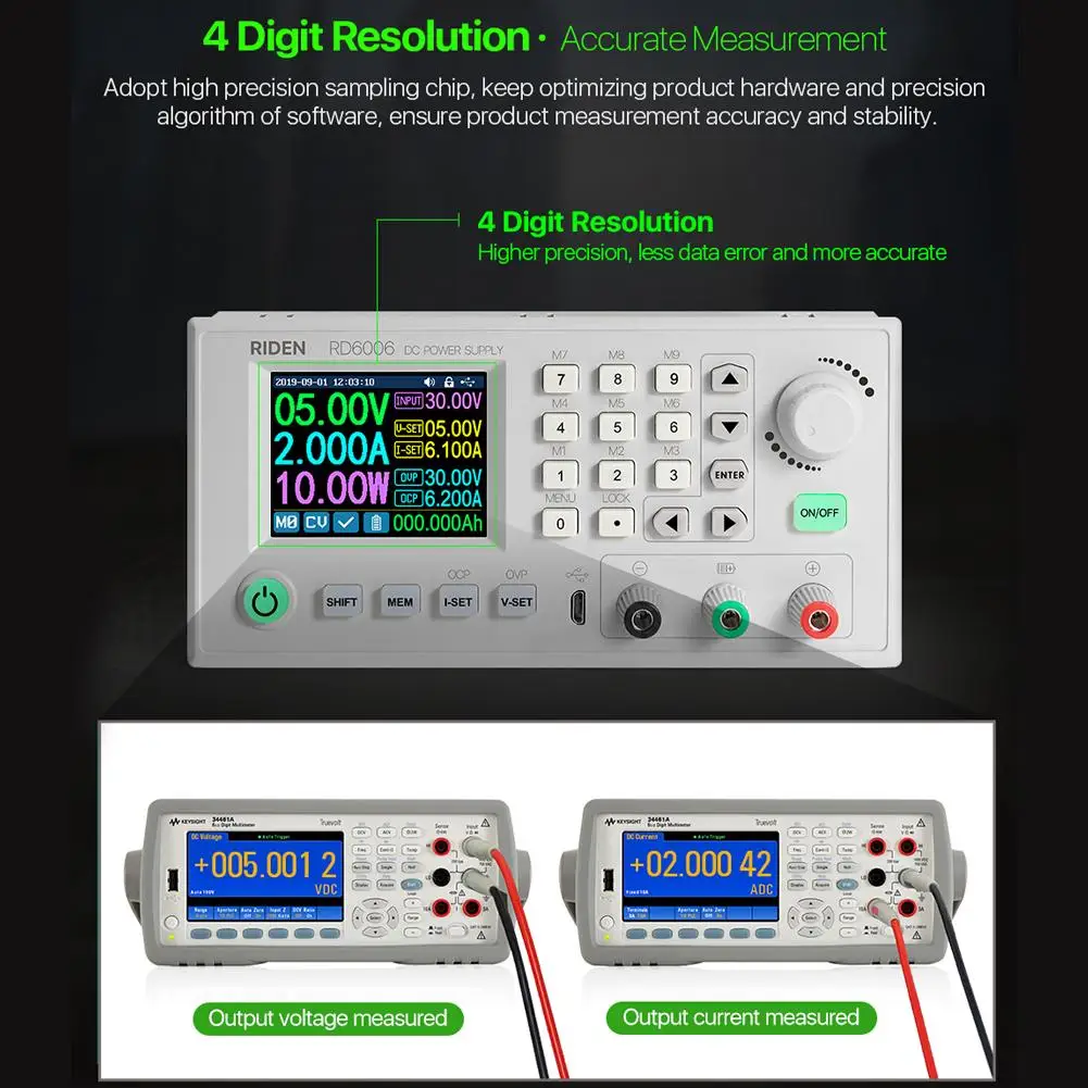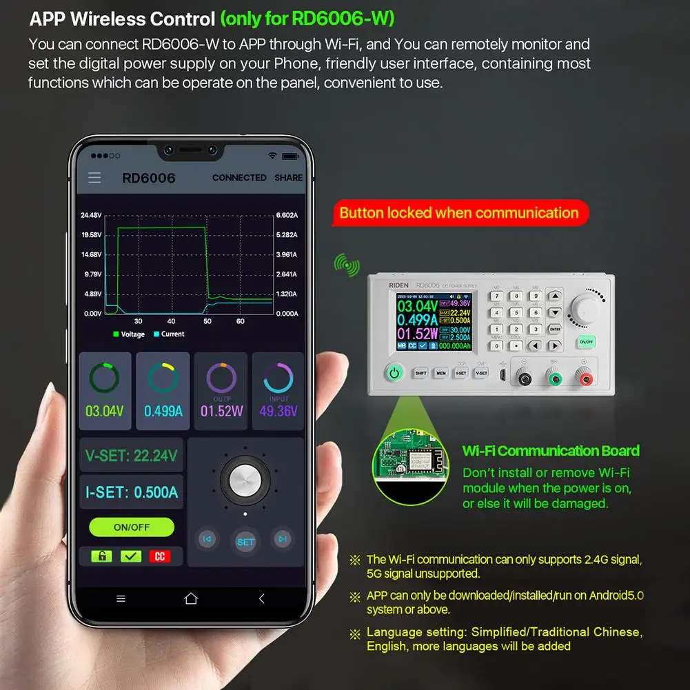 Есть две версии rd6006: rd6006 и rd6006-w. rd6006-w имеет Wi-Fi карту, но rd6006 не делает. Rd6006-w можно подключать к приложениям и программному обеспечению с помощью WiFi карты или к компьютеру SOLFTWARE с помощью кабеля micro USB. Rd6006 не имеет Wi-Fi карты. Он может поддерживать только компьютерное программное обеспечение через микро usb-кабель, который не совместим с приложением.