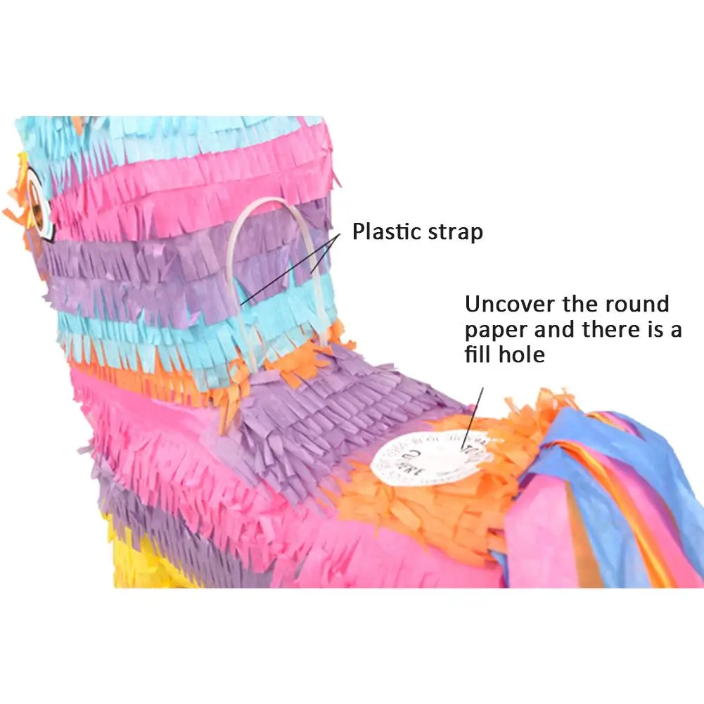 На задней стороне пинаты есть круглая отметка, а на нижней части-отверстия. Заполните подарочную коробку для конфет, которую вы приготовили здесь, и поставьте с палочкой pinata.