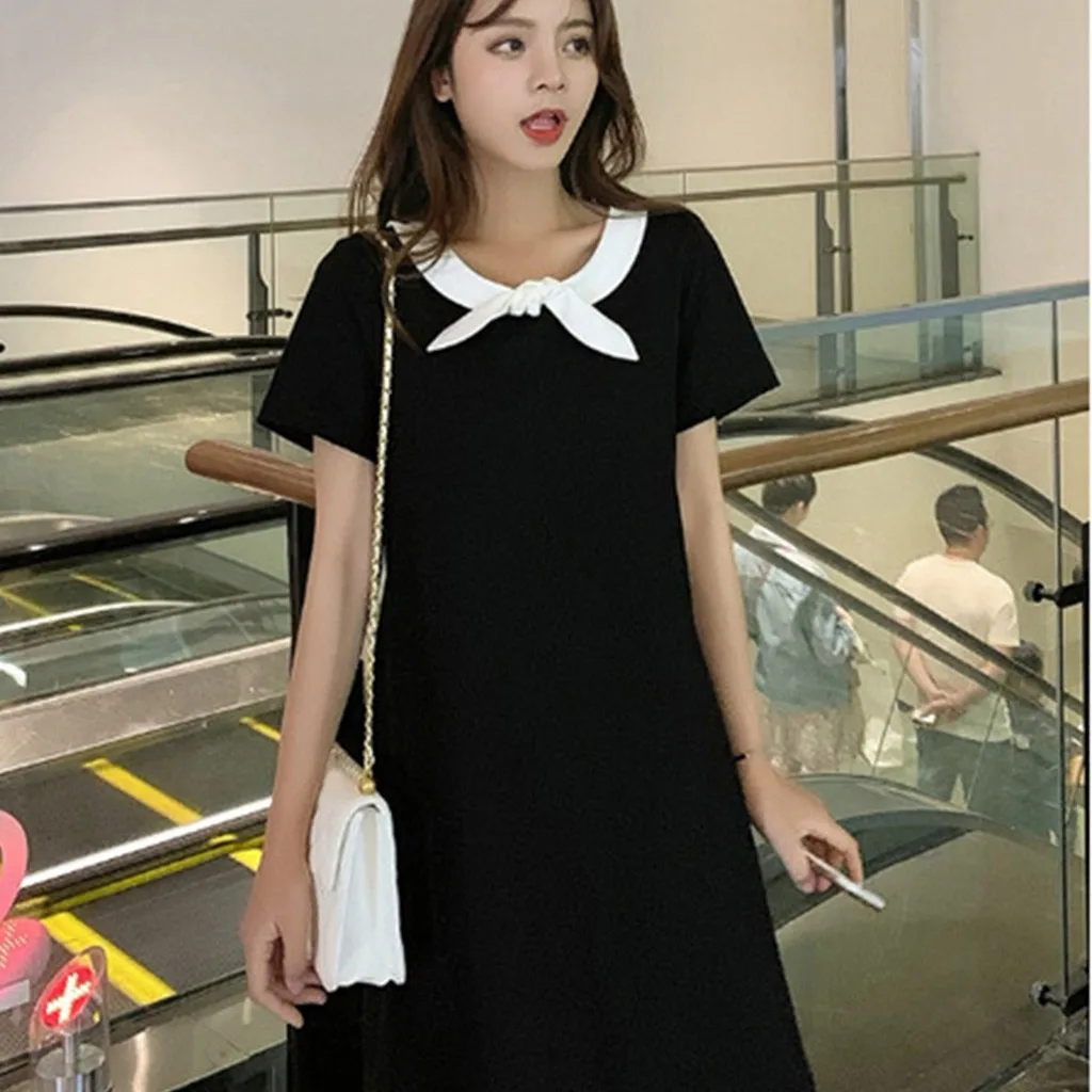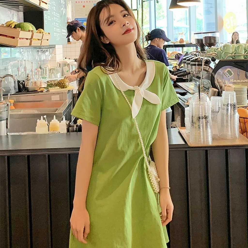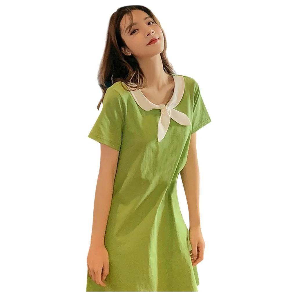 Женское однотонное летнее платье с круглым вырезом и бантом с коротким рукавом