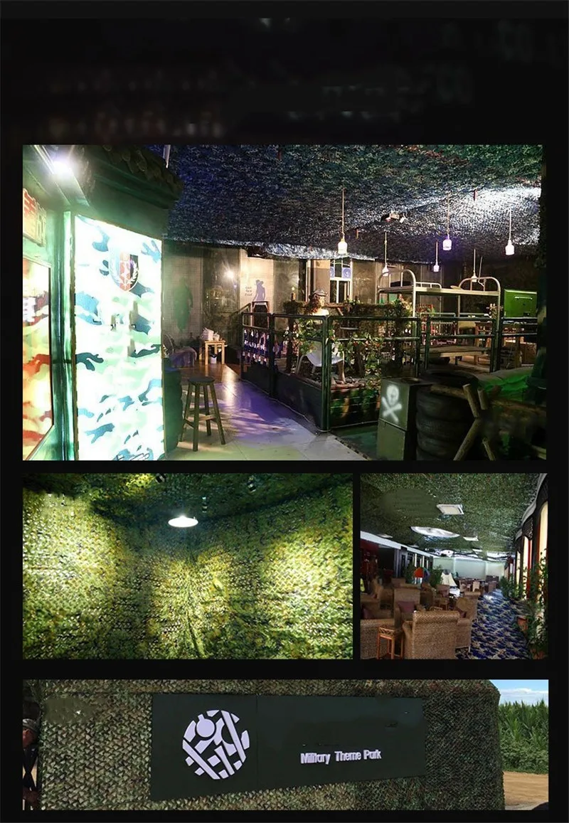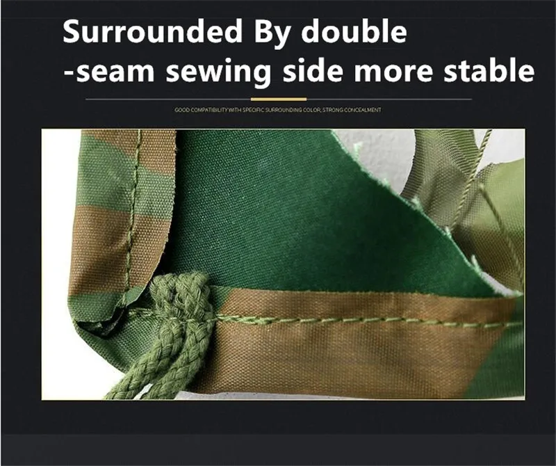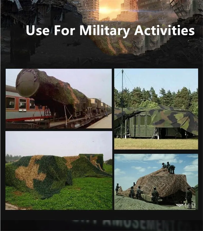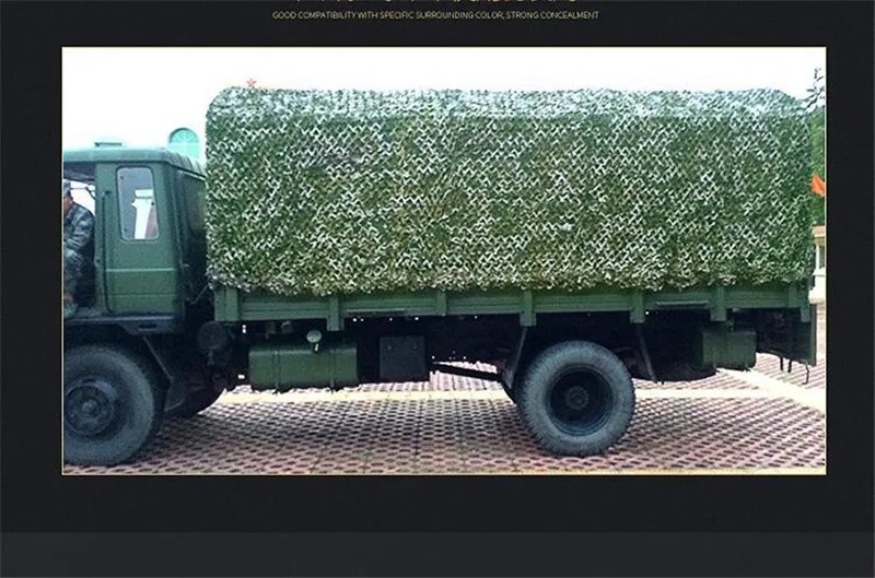 Технические характеристики: Название продукта: камуфляжная сетка Материал: оксфордская полиэфирная ткань Цвет: камуфляж, армейский зеленый, морской Камуфляж Особенности: -100% Новое и высокое качество. -Камуфляж очень эффективный, реалистичный эффект и универсальный. Основная роль и цели: -Камуфляжная армейская подготовка, военные установки анти-Инфракрасный радар. -Аэрофотосъемка компании по продаже автомобилей с защитой от простоя. -Незаконная фотосъемка зданий и растений. -Автопарки и другие места общего пользования затеняют ландшафтный дизайн. -Горное и зеленое покрытие, покрытие мусора. -Для любителей наблюдения за птицами нужно снимать вдали и при соприкосновении с птицами камуфляж. -Wargame Снайпер камуфляж и использование. -Декоративный ландшафтный дизайн (тематические парки, выставки, пленочная база, наружная разработка, CS поле моделирования, украшения отеля, промышленное украшение, украшение дома и т. д.), цвет фона имитация и другие стороны. Демонстрация товара
