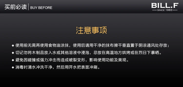 Вопросы, требующие внимания ●Перед использованием не нужно использовать пищевое масло. После использования просушите его чистой тканью и храните в прохладном и проветриваемом месте ●Не помещайте деревянные изделия в воду или другое замачивание, не выпекайте в месте высокой температуры и не подвергайте воздействию солнца. ●Избегайте растрескивания из-за столкновения или сильного воздействия, влияющего на функцию использования и эстетику ※ Промойте поверхность чистой водой во время дезинфекции, а затем промойте поверхность кипяченой водой