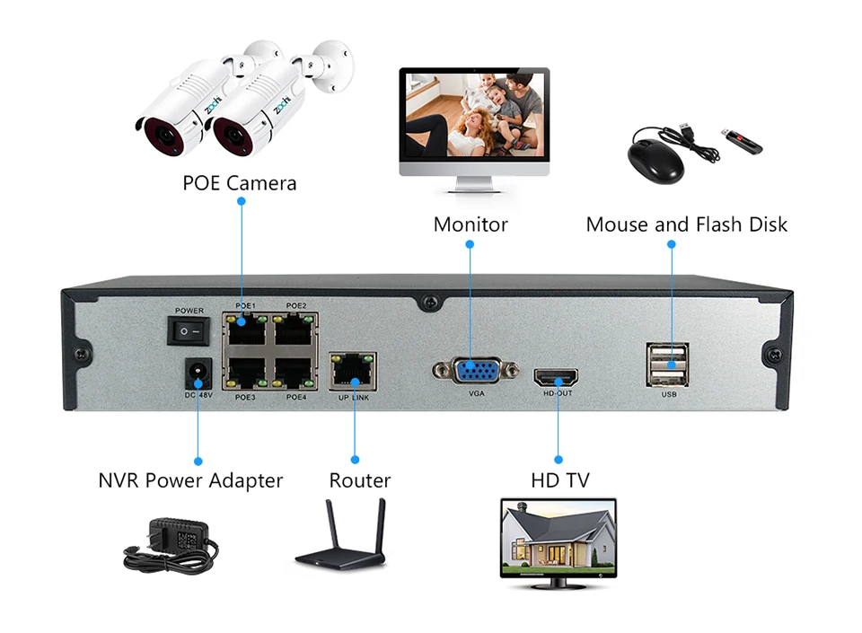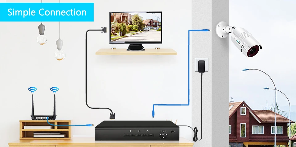 Эта система также не требует BNC видео кабель, коммутатор POE и разъем. Кроме обеспечения питания, установка проста, значительно экономит ваше время, пространство и затраты. Пожалуйста, обратите внимание, что этой системе не нужен коммутатор POE.