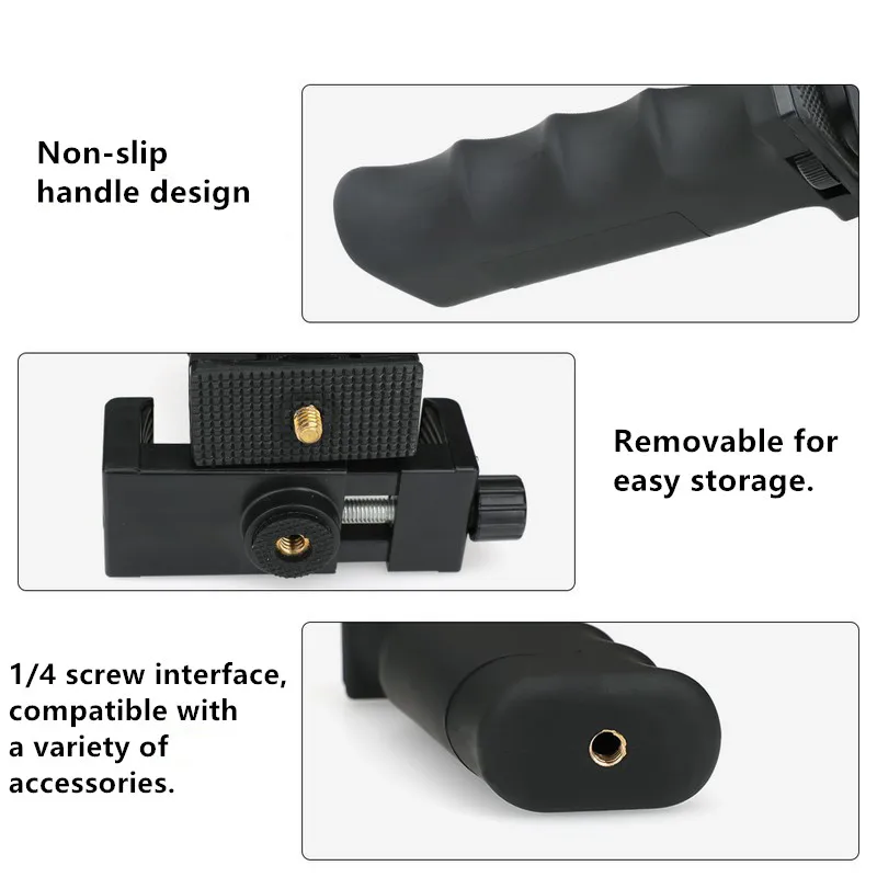Опишите: 1. Съемный для удобного хранения. 2,1/4 резьбовое отверстие Совместимо с широким диапазоном аксессуаров. 3. Нескользящая ручка для уменьшения дрожания. Материал: АБС-пластик Вес: 113 г Отправить список: 1 x ручка 1 x зажим