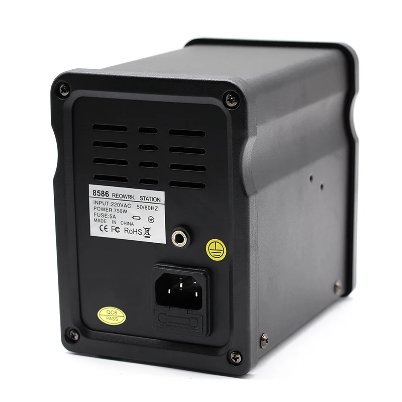 Это совершенно новая паяльная станция 2 в 1 SMD 8586. Металлический корпус из сплава с высококачественным силиконовым корпусом отличается элегантным внешним видом и энергосбережением. Вы можете использовать пистолет горячего воздуха и паяльник отдельно, без помех друг с другом.
