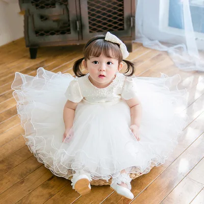 Детское платье; Праздничная одежда для малышей; Платье из тюля с короткими рукавами и бусинами для малышей на первый День рождения; Платье для крещения для новорожденных девочек