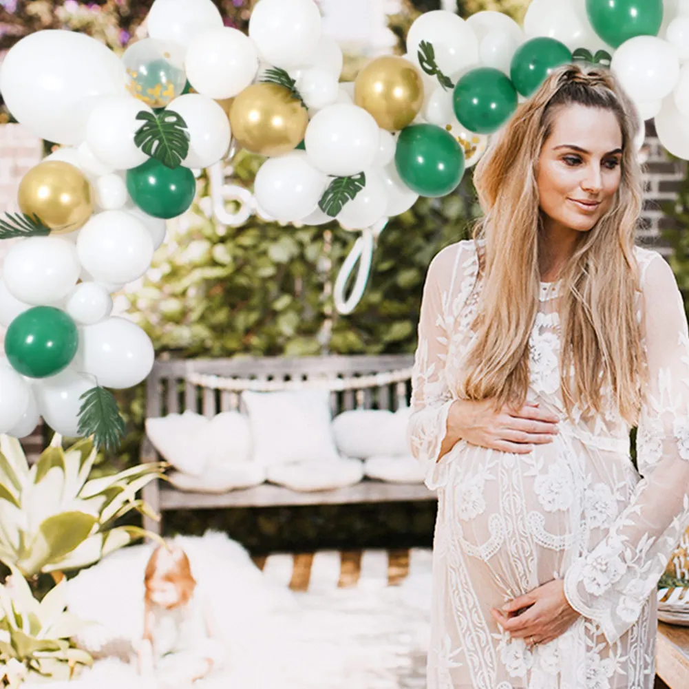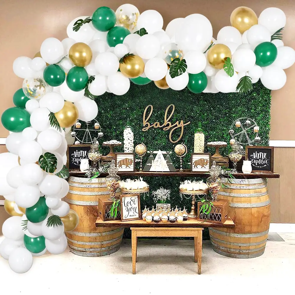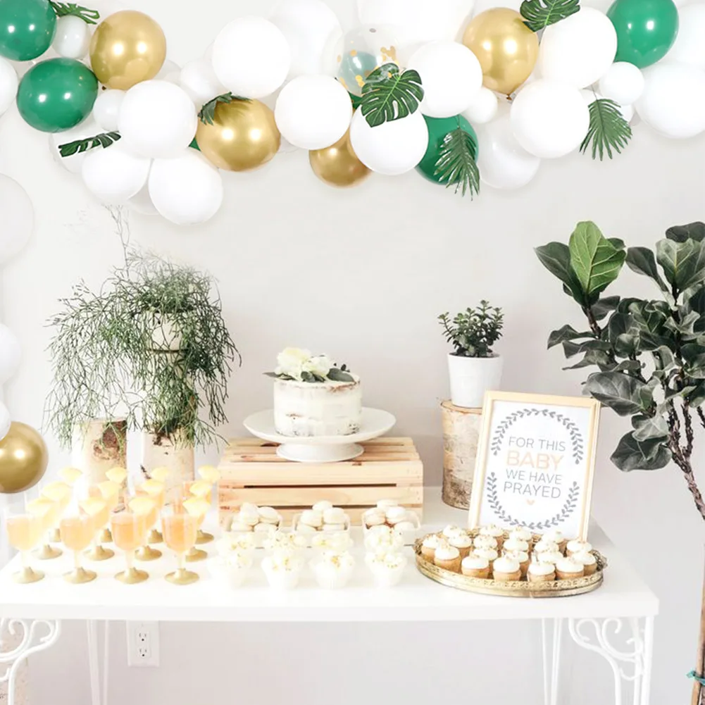 Комплект «все в одном» включает в себя: 30 шт 5 дюймов белые шарики + 50 шт 12 дюймов белые шары + 3 шт Экстра 18 дюймов белые шары + 10 шт Золотые шарики и 5 шары с золотыми конфетти + 10 шт зеленые шары + 10 шт Искусственные Пальмовые Листья для баллонной ленты 18 футов, 32 ножная длинная баллоновая лента, 100 шт. баллонная точка Гуле, 1 шт. баллон инструмент для галстука Материал: латекс Вес: 440 г Применение: свадьба, детский душ