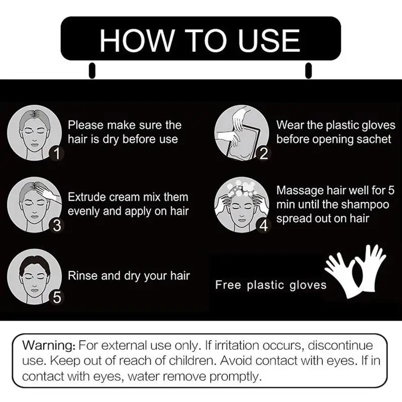 Описание: 100% новое, высокое качество. Подходящие предметы: взрослые, подростковые, детские, седые волосы Тип: краска для волос Цвет: черный Вес нетто: 25 мл * 10 упаковок Эффективность: шампунь для черных волос может немедленно превратить белые волосы и белые волосы в черные, не обесцвечивая кожу головы Как использовать: Влажные волосы 2. Надевайте одноразовые перчатки 3. Сделайте черный шампунь Sevich для ваших волос 4. Массируйте волосы в течение 5 минут 5. Чистка и сушка волос 6. Сравните перед использованием, Окрашенный черный Преимущества шампуня Sevich Формула от производителя 2. Очистите кожу головы 3. Удобно и быстро 4. Мягкая 5. Держите 6. Пахнет и расслабляет 7. Для черно-белого цвета и седых волос требуется всего 5 минут 8. Только для волос, а не для кожи головы Посылка включает в себя: 10 * черный шампунь