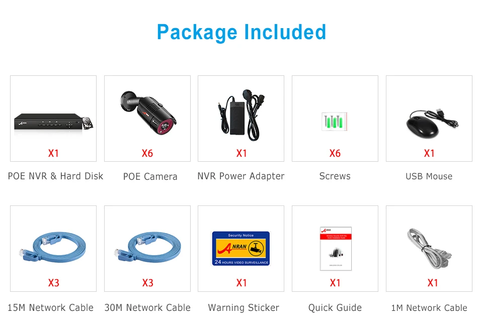 · 1х 8-канальный POE NVR · 6x пуля камеры · 1x адаптер питания NVR · 6x Упаковка винтов · 1x USB Мышь · 3x15 м Ethernet кабеля · 3x30 м Ethernet кабеля · Предупреждение ющая наклейка (подарок) • 1x Руководство по быстрой без жесткого диска · 1x1 м сетевой кабель