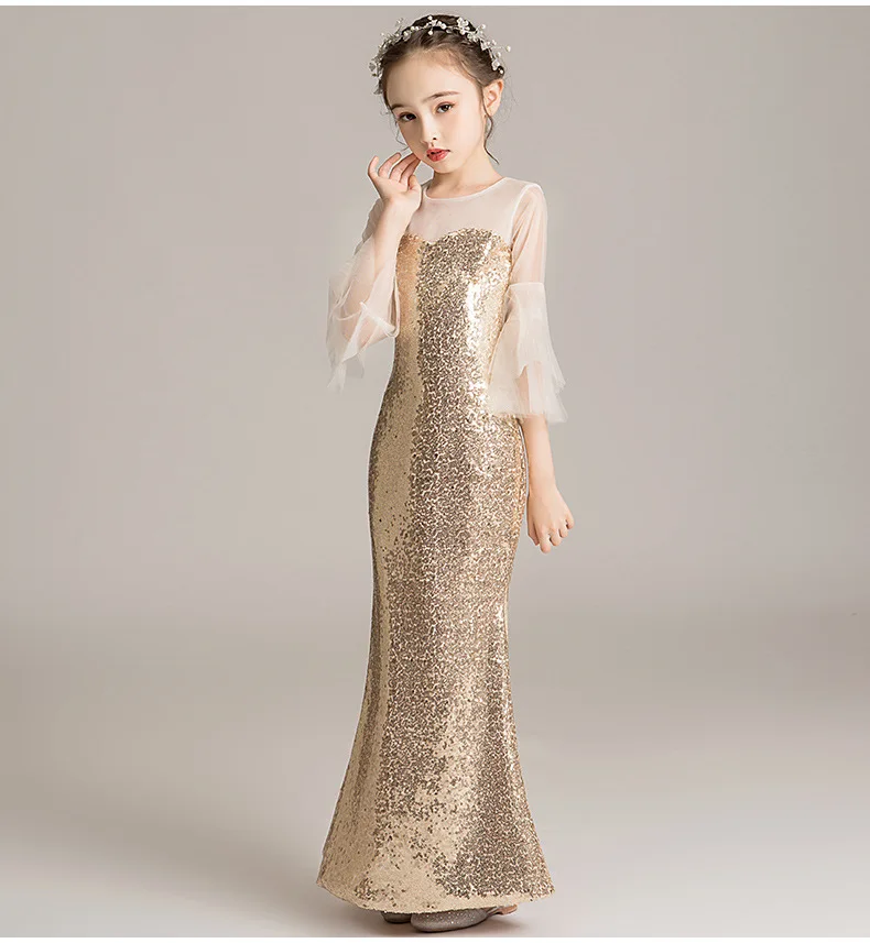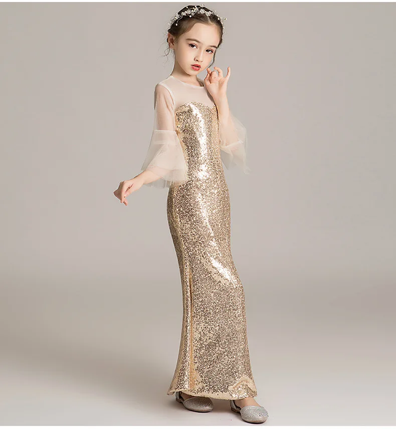 Золотое свадебное платье для девочек, расшитое блестками, сексуальное облегающее вечернее платье русалки, вечерние платья для девочек, костюм для подиума, детская одежда, Vestidos