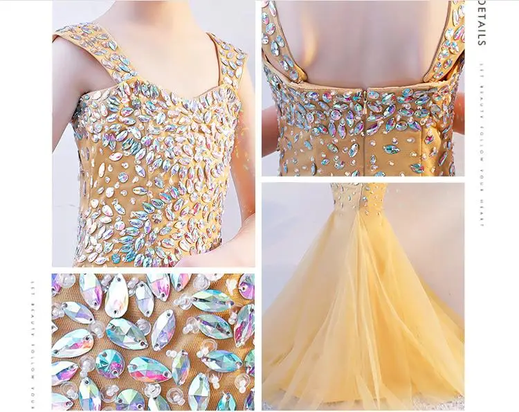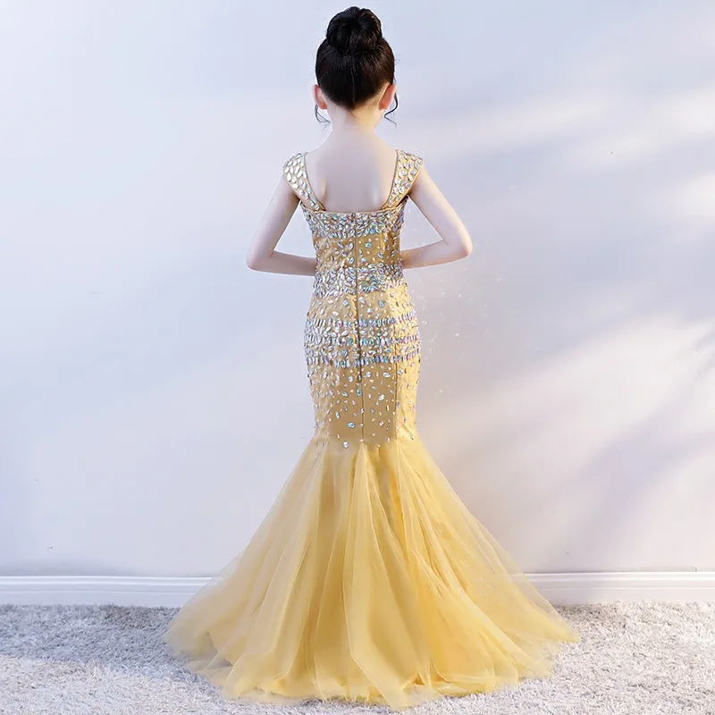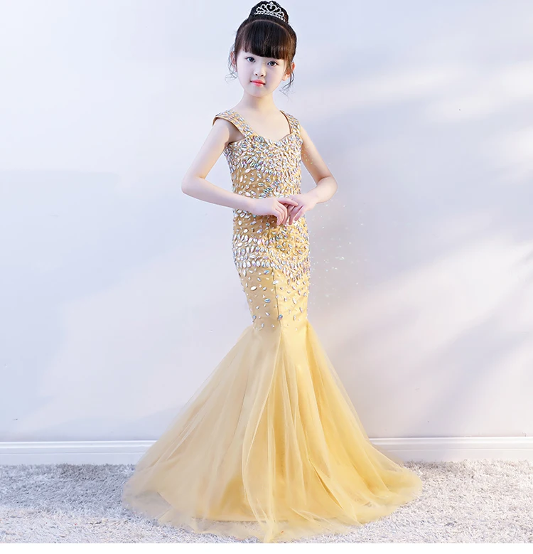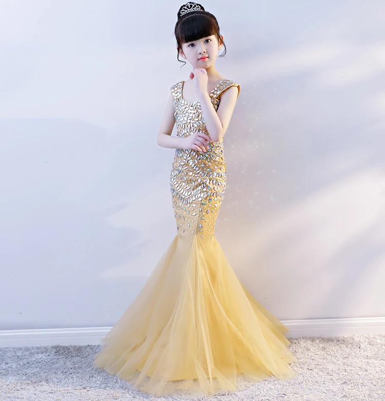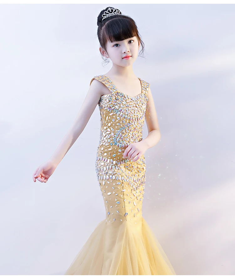 Роскошные золотые платье принцессы-Русалочки с вечерние платье с украшением в виде кристаллов с отделкой бисером детская Праздничное платье костюм для первого дня рождения с фатиновой юбкой в форме рыбьего хвоста, платье в строгом стиле для девочек, платье