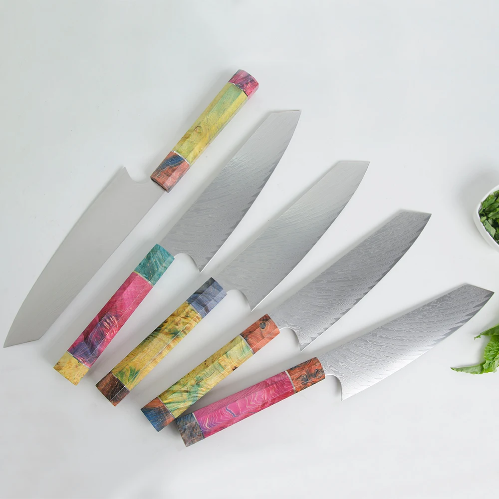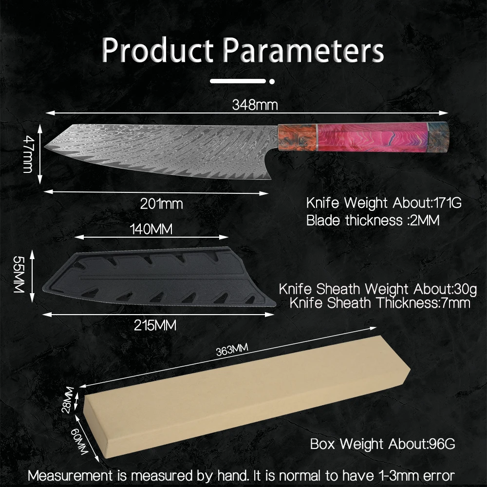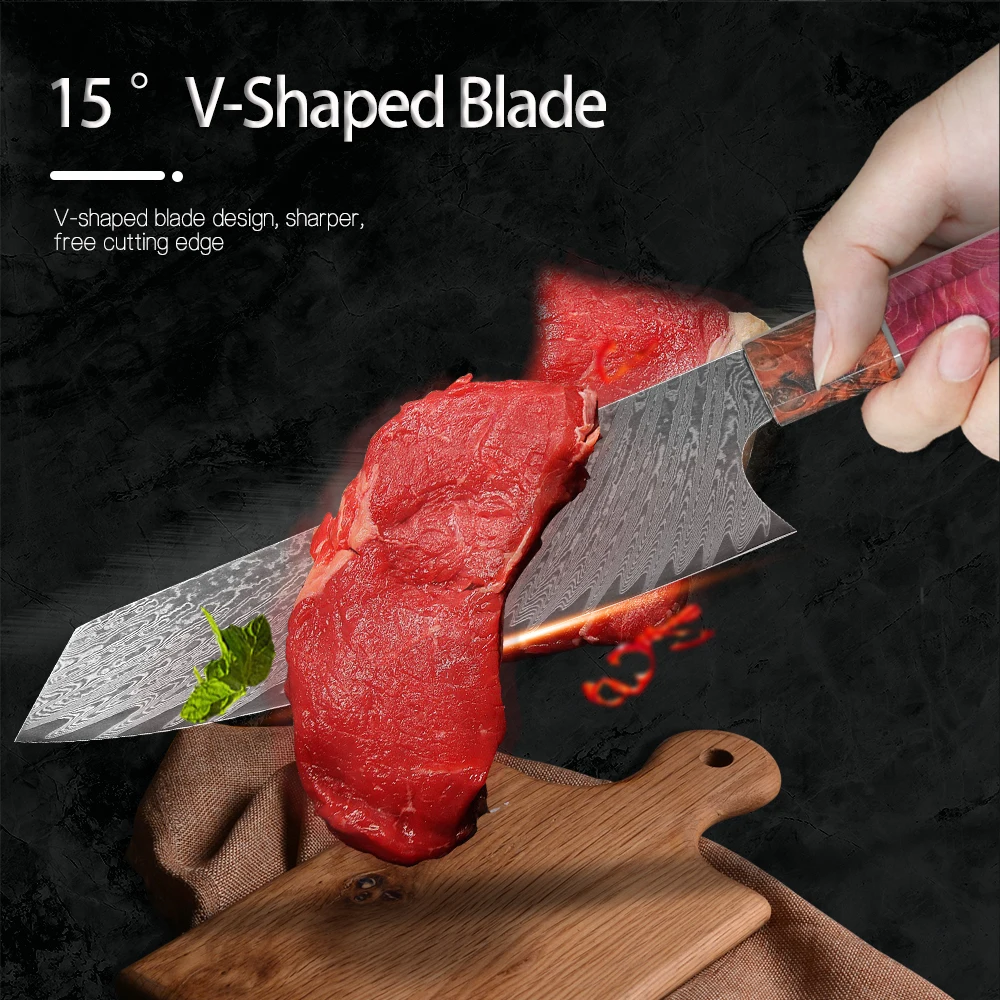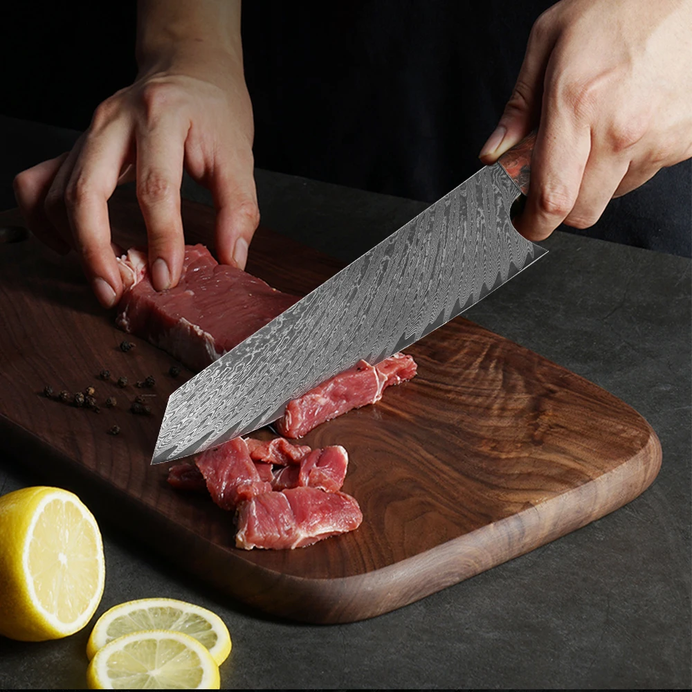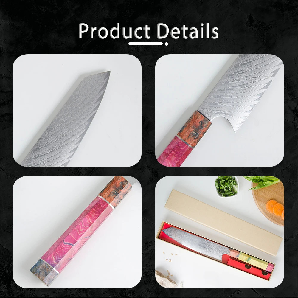Супер острое лезвие искусно изготовлено из 67 слоев VG-10 японской высокоуглеродистой нержавеющей стали обеспечивает исключительную прочность, долговечность и устойчивость к пятнам. V-Glod 10 японский супер стальной режущий сердечник с твердостью 62 + Rockwell. Кухонный нож, изготовленный с VG10, имеет лучшую прочность на края, удержание, остроту.