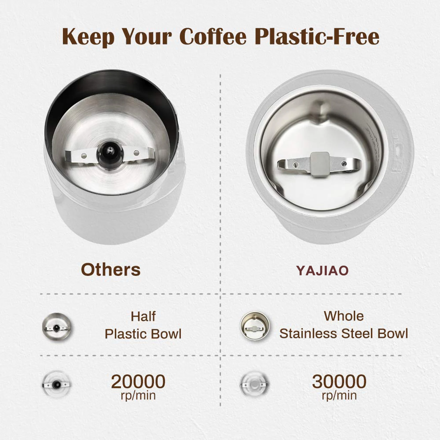 Лезвие из нержавеющей стали обеспечивает долговечность и высокую производительность. При 9000 rp/min это займет всего несколько секунд, чтобы Измельчить достаточное количество кофейных зерен до 12 чашек кофе