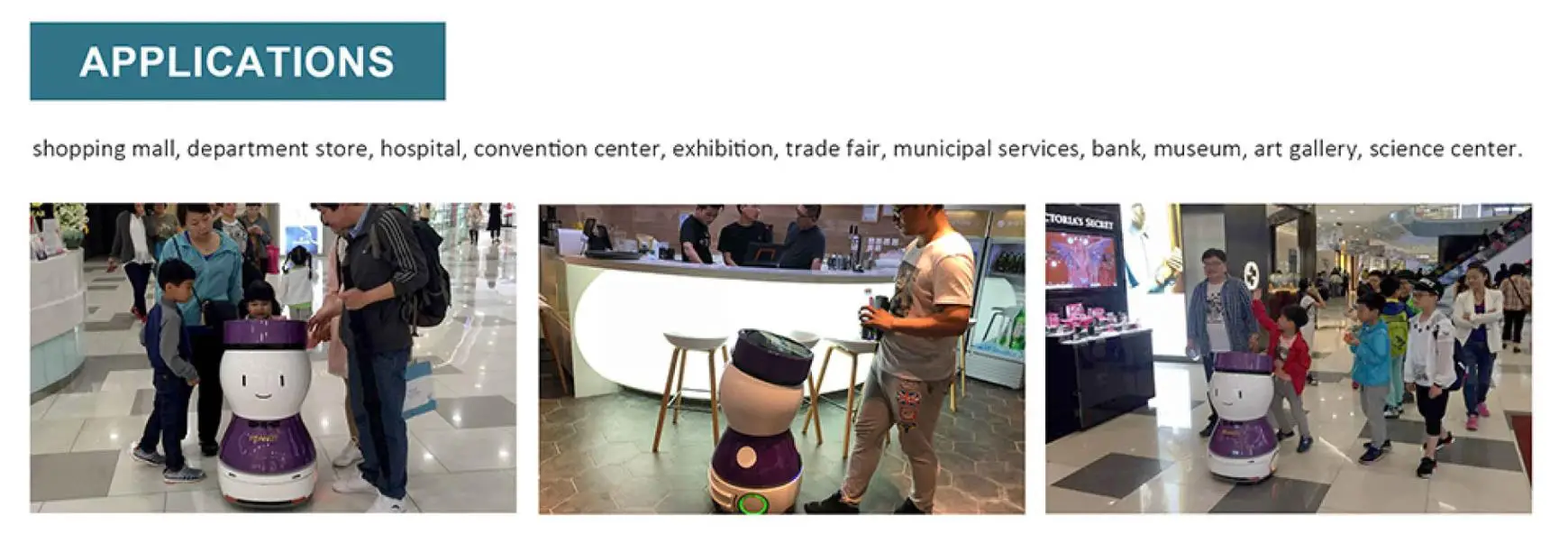 Ведущий робот арахиса является коммерческим мобильным сервисным роботом в помещении, который сочетает в себе технологии slam и AI. Он может достичь полного автономного позиционирования, навигации и интеллектуального избегания препятствий с помощью машинного видения и лидара, и может перемещаться независимо в помещении и взаимодействовать с людьми разумно. Предоставьте руководство, руководство по покупкам, голосовую беседу и другие услуги. Коммерческий направляющий робот является лучшим партнером, чтобы вести acurate путь для каждого клиента. Это делает точное руководство в Висте отображения рекламных роликов. Этот направляющий робот применяет лучшие сенсорные технологии, датчики LIDAR/SLAM/Infrared/sonar, чтобы осуществить автономное и точное планирование пути и навигацию. Машинного зрения И глубокие технологии визуального распознавания применяются, чтобы гарантировать точное Предотвращение препятствий. Он также предоставляет два 21,5 рекламы дисплей для рекламы коммерческой рекламы. Это может быть открытие торговых центров, универмагов, больниц, конференц-центров, выставочных и торговых ярмарок, а также может быть экспозицией в музее, художественной галерее и научном центре И т. д.