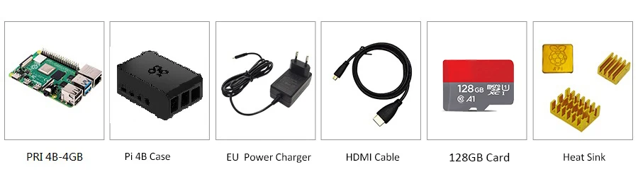 1.Raspberry Pi 4 модель B-4GB RAM 2. Подлинный чехол из АБС-пластика Pi 4 3. Адаптер питания ЕС 5 в 3 А Type-C 4.Raspberry Pi 4 Модель B HDMI кабель 5,128G TF карта 6.Raspberry Pi 4 Модель B радиатор