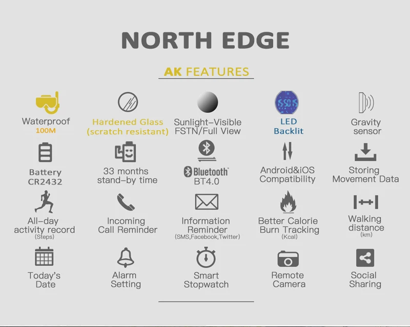 1. Водонепроницаемый 100 м 2. Закалённое стекло (устойчивость к царапинам) 3. Видимый Солнечный свет Дисплеем FSTN/Full View 4. Светодиодный клавиатура с подсветкой 5. Датчик поворачивания экрана 6. Батарея CR2432 7. 33 месяца в режиме ожидания 8. Bluetooth 4,0 9. Совместимость с Android и IOS 10. Хранение даты движения 11. Запись активности на весь день 12. Напоминание о входящем звонке/Информационное напоминание 13. Тесто отслеживание сожженных калорий 14. Пешком 15. Текущая дата 16. Настройка будильника 17. Секундомер 18. Удаленная камера/обмен данными в социальных сетях